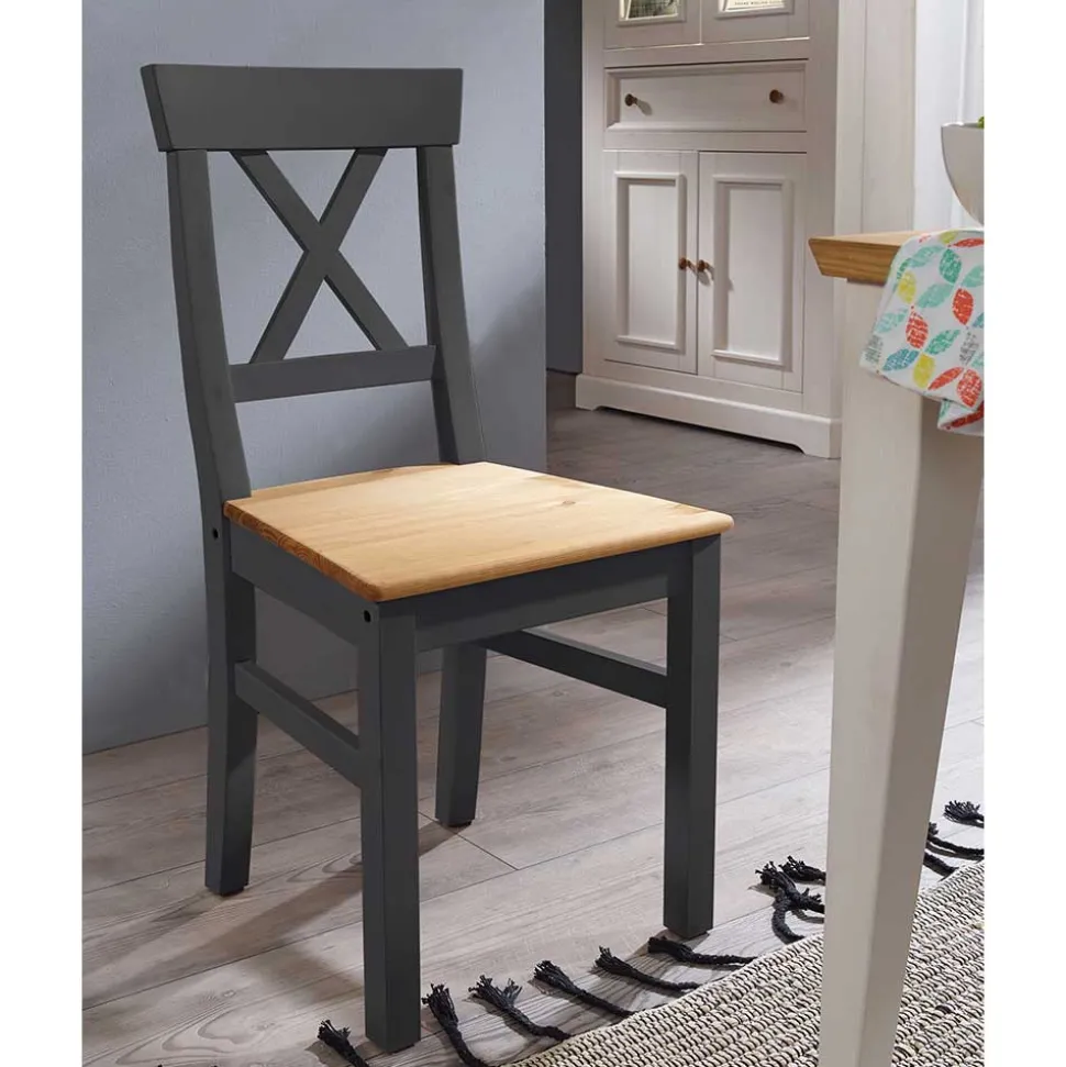Der dekorative Holzstuhl „Ustricia“ ist der perfekte Sitzgelegenheit für Ihr Zuhause. Er ist aus massivem Kiefernholz hergestellt und verfügt über graue Holzoberflächen, die gewachst sind, sowie einen eichefarben lackierten Sitz. Der Stuhl zeichnet sich durch seinen kontraststarken Landhaus-Stil und seine dekorativen Verstrebungen in der Holzlehne aus.