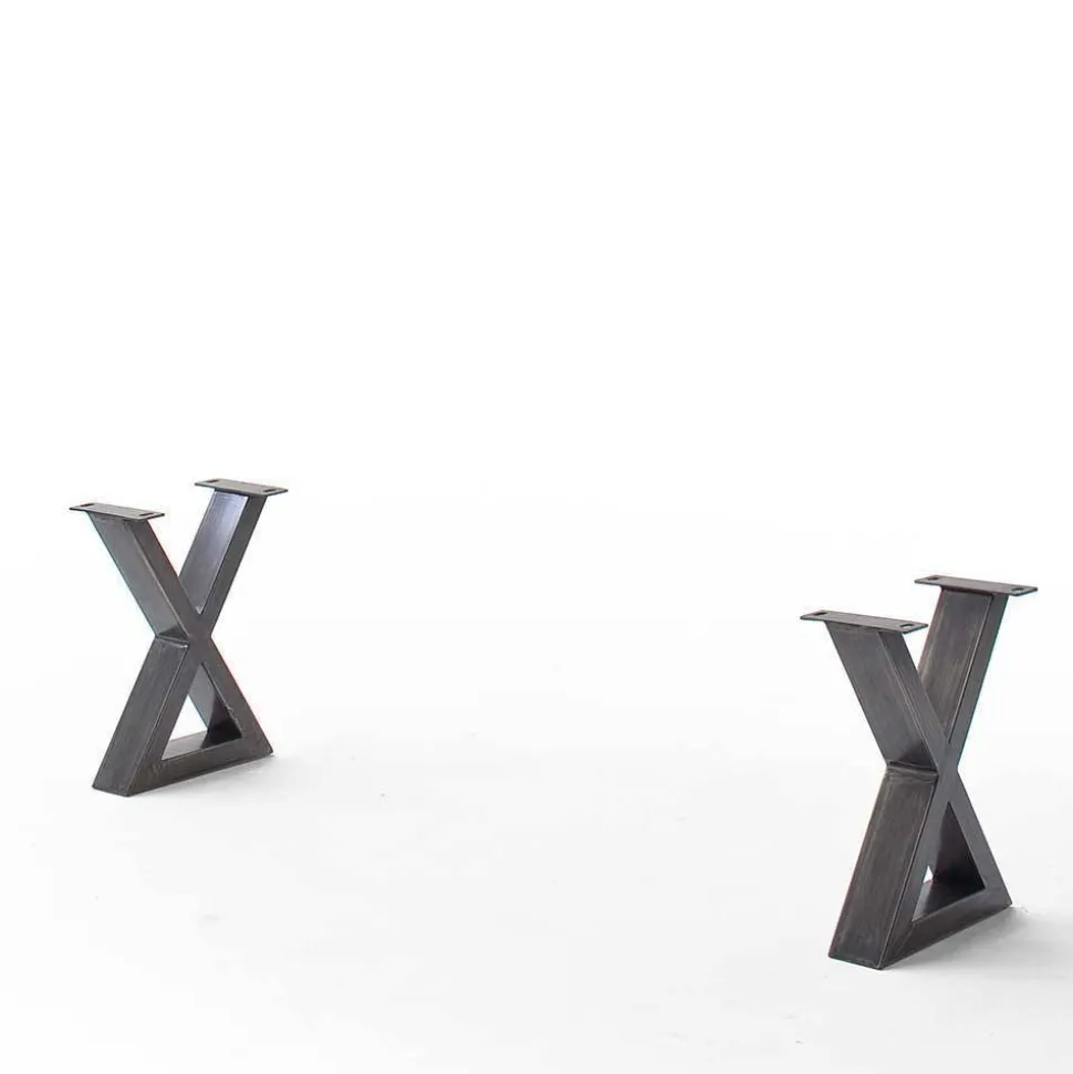 Die stilvollen X-Beine aus Metall sorgen für eine stabile Basis und sind in einem Antik-Look gewischt, was ihnen eine ansprechende Altsilber-Farbgebung verleiht. Diese markanten Beine unterstreichen den industriellen Charakter der Bank und bieten gleichzeitig eine breite, durchgehende Bodenauflage für zusätzliche Stabilität.