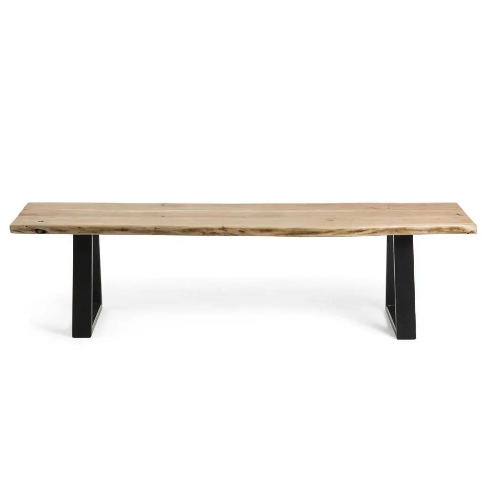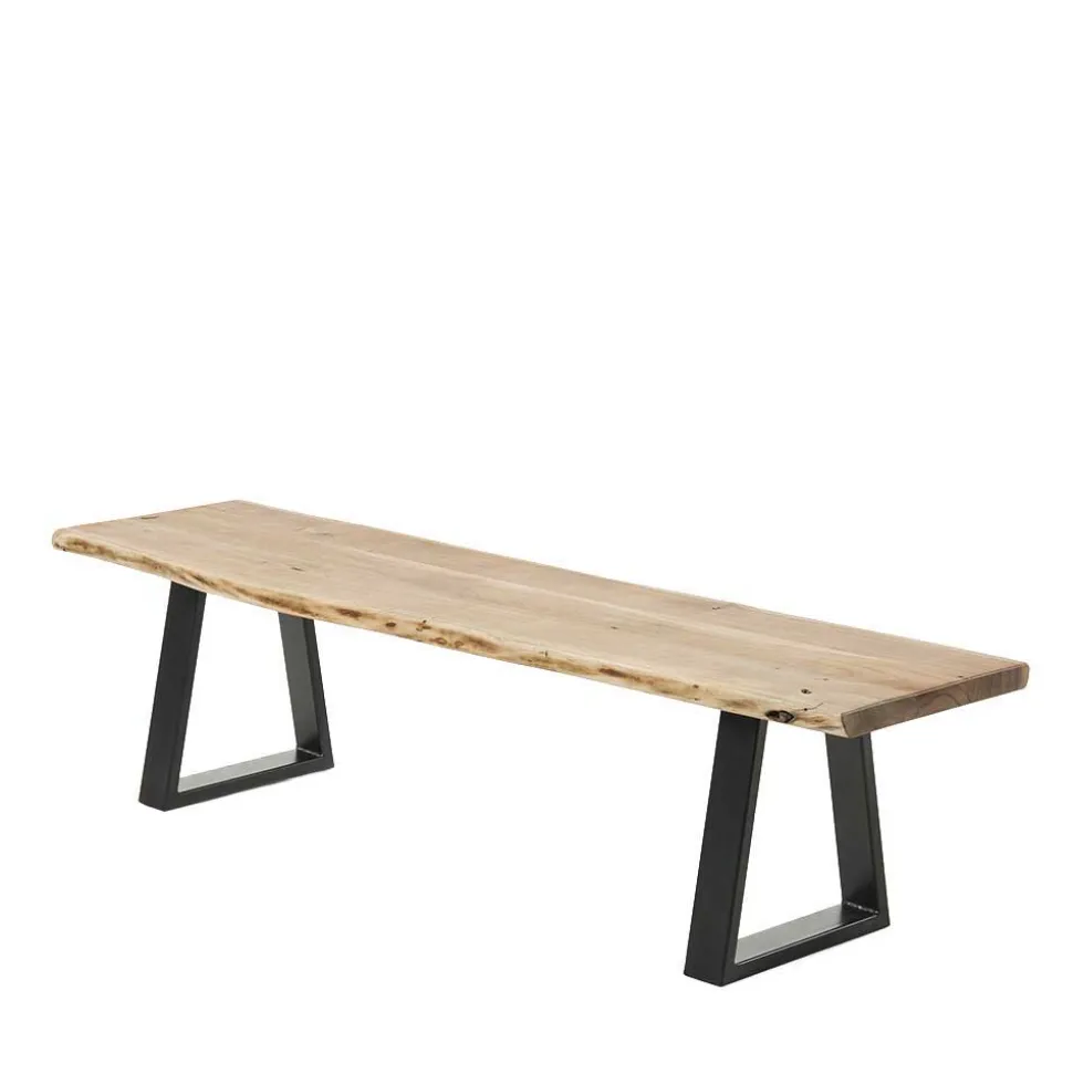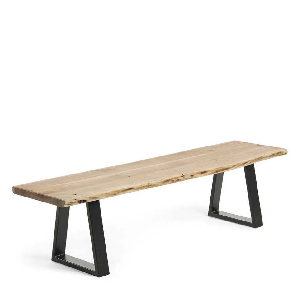 Die Kombination aus lebendiger Massivholz-Oberfläche und einem schwarz pulverbeschichteten Stahlgestell in Trapezform macht die Sitzbank „Dumassa“ zu einem wahren Highlight. Der Materialmix aus Holz und Metall setzt stilvolle Akzente und passt perfekt zu verschiedenen Einrichtungsstilen, sei es modern, rustikal oder industriell.