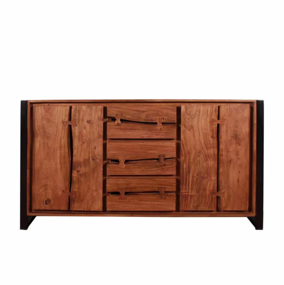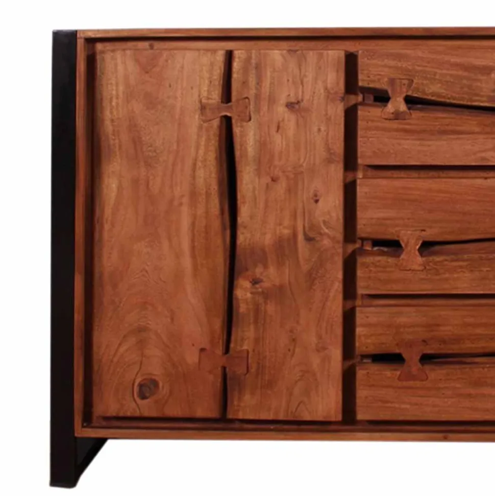 Neben seiner beeindruckenden Optik bietet die Anrichte „Smantana“ praktischen Stauraum und Organisation. Mit einer Breite von 200 cm, einer Höhe von 80 cm und einer Tiefe von 40 cm, ausgestattet mit zwei Türen und drei Schubkästen, bietet dieses Möbelstück reichlich Platz für Ihre Wohnbedürfnisse. Die Schubladen und Türen, verziert mit einzigartigen Schwalbenschwanz-Verbindungen, sprechen für die Qualität und das Auge fürs Detail, das in jedes unserer Produkte fließt.