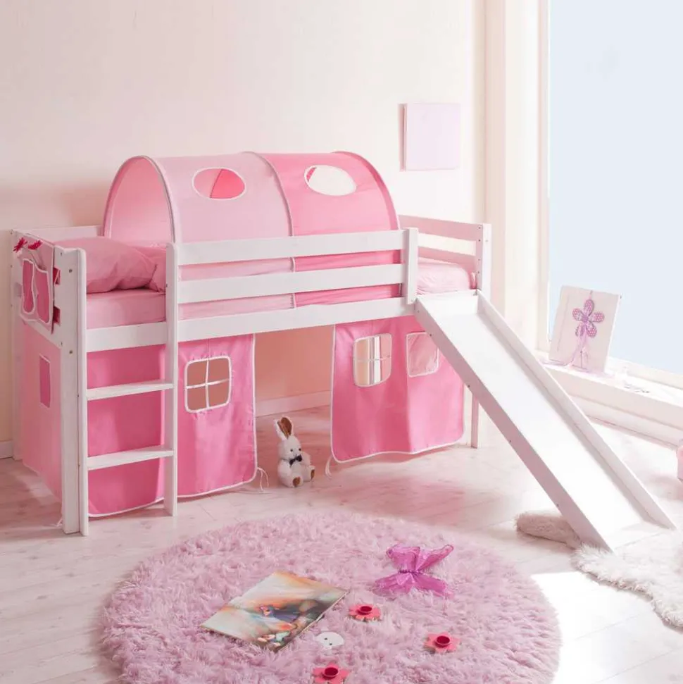 - Weißes Rutschbett mit Vorhang-Set in Pink-Rosa