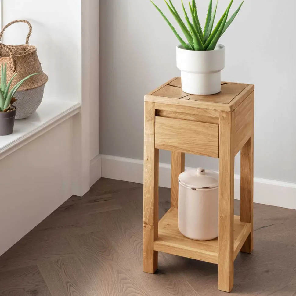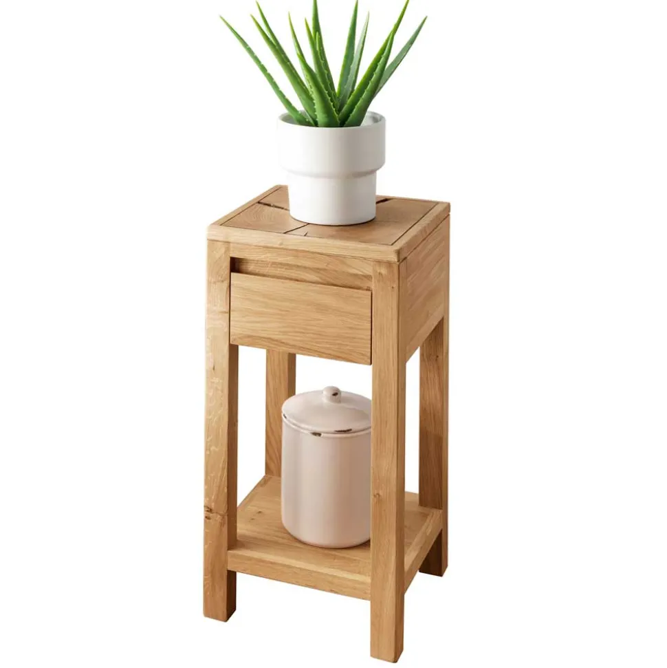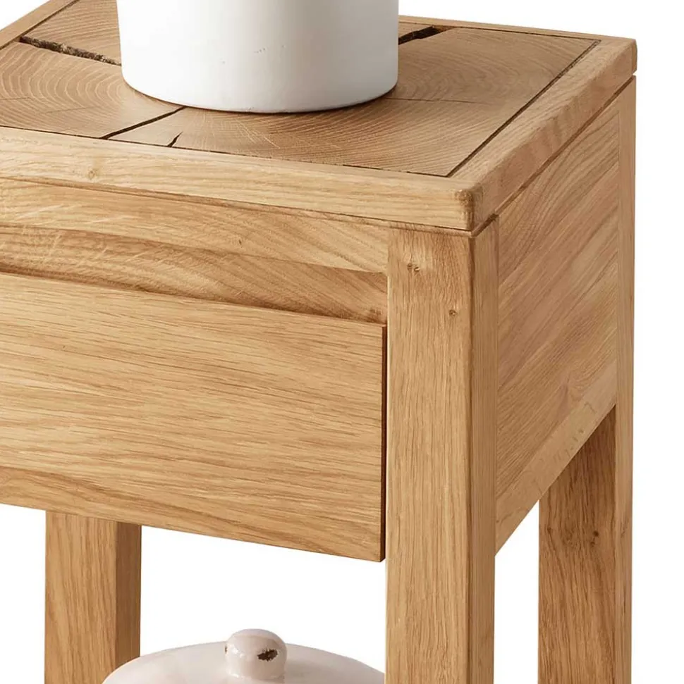 Wildeiche ist bekannt für ihre Härte und Langlebigkeit, was sie zu einem idealen Material für hochwertige Möbel macht. Das Holz dieses Beistelltisches ist nicht nur massiv und robust, sondern überzeugt auch mit seiner markanten Maserung, die jedem Stück einen individuellen Charakter verleiht. Das natürliche Ölen der Oberflächen schützt das Holz und bringt seine warme Farbgebung sowie die lebendige Textur zur Geltung.