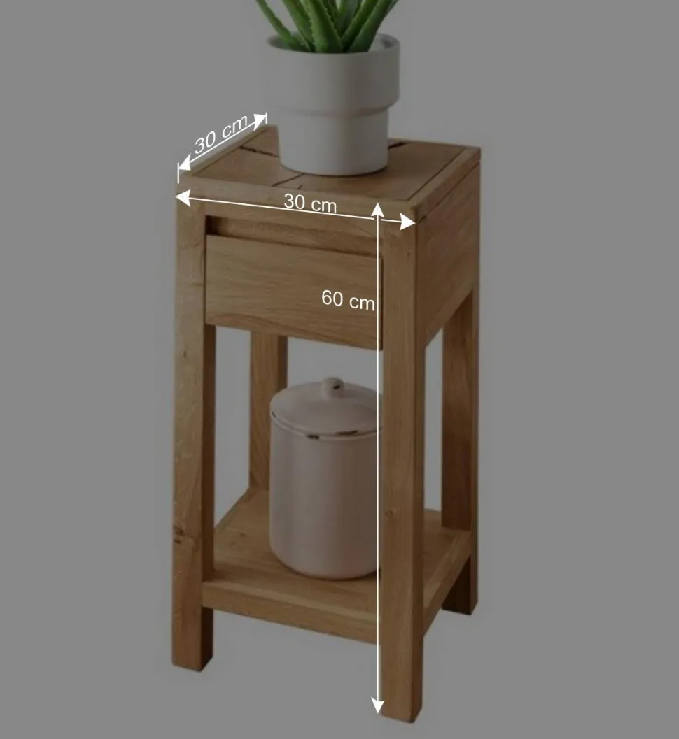 Das stabile Vierfußgestell aus massiven Kanthölzern garantiert nicht nur Standfestigkeit, sondern unterstreicht auch das robuste Design. Mit Abmessungen von 30 cm Breite, 60 cm Höhe und 30 cm Tiefe ist dieser Beistelltisch vielseitig einsetzbar – ob als Nachttisch, neben Ihrem Lieblingssessel oder als praktische Ablage im Flur.