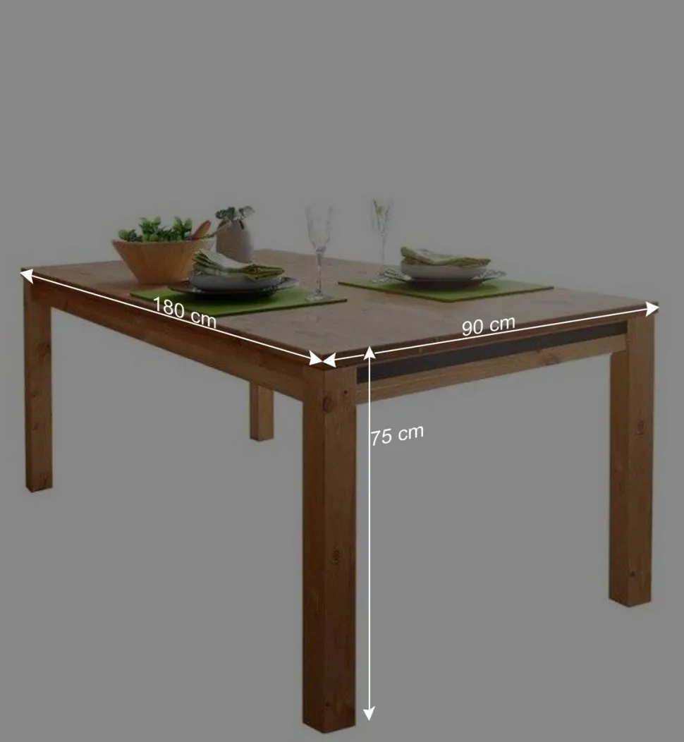 Mit einer Breite von 180 cm und einer Tiefe von 90 cm bietet der Esstisch „Filedria“ reichlich Platz für Ihre Familie und Gäste. Die massive Tischplatte ist ca. 3,0 cm stark und wird von einem stabilen Vierfußgestell getragen, das aus robusten Vierkanthölzern gefertigt ist. Schwarze Metallleisten an den Kopfseiten setzen moderne Akzente und vervollständigen das stilvolle Gesamtbild. Der Abstand vom Boden bis zur Unterkante der Zarge beträgt ca. 64 cm, was ausreichend Beinfreiheit gewährleistet.