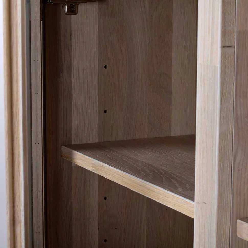 Gefertigt aus massivem Eichenholz, zeichnet sich der Vitrinenschrank durch eine individuelle Holzmaserung aus, die jedes Stück zu einem Unikat macht. Eiche ist nicht nur für seine Langlebigkeit und Robustheit bekannt, sondern auch für seine ansprechende Optik, die Wärme und Natürlichkeit ausstrahlt.