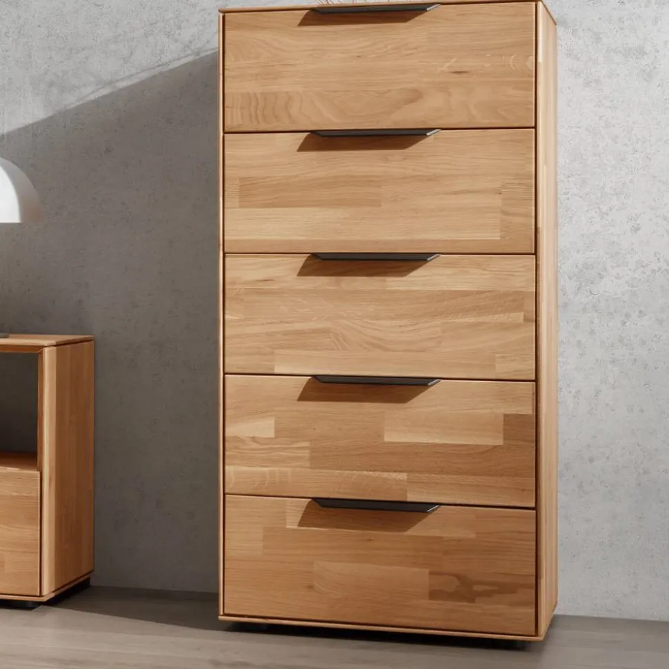 Mit fünf großzügigen Schubladen bietet die „Kassanda“ reichlich Stauraum für Kleidung, Wäsche oder Alltagsgegenstände. Dank der Metallauszüge mit Soft-Close-Technik schließen alle Schubladen sanft und leise. Besonders edel wirken die schwarz eloxierten Kantengriffe aus Aluminium – sie ergänzen das natürliche Wildeichenholz perfekt. Die Griffe werden separat geliefert und lassen sich im Handumdrehen montieren.