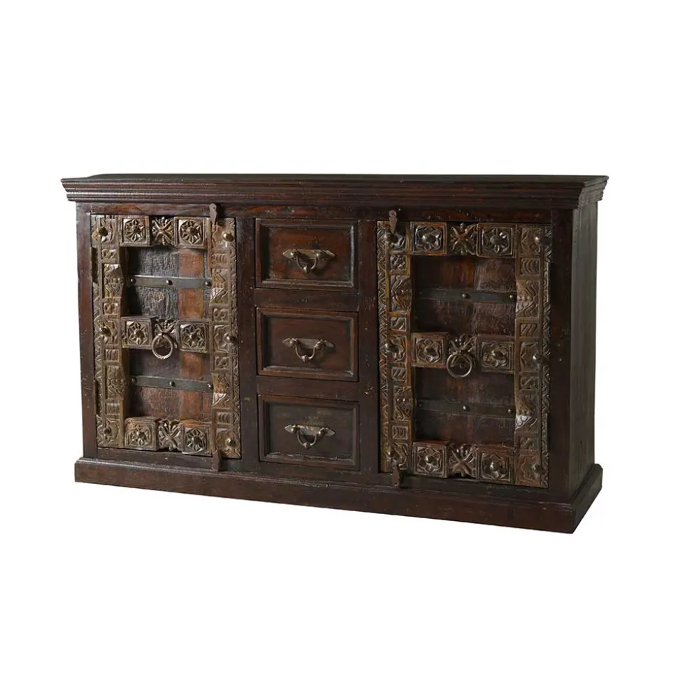 Eintauchen in eine Welt von erlesener Handwerkskunst und zeitlosem Design mit unserem Sideboard „Solapura“. Inspiriert vom indischen Kolonialstil, verkörpert dieses Möbelstück eine faszinierende Mischung aus traditionellen indischen Motiven und der robusten Eleganz kolonialer Einflüsse. Der indische Kolonialstil zeichnet sich durch die Verwendung dunkler Hölzer, aufwendiger Schnitzereien und metallischer Akzente aus, eine Ästhetik, die unser Sideboard meisterhaft nachbildet.