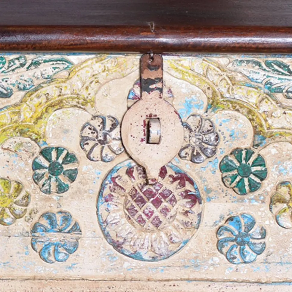 Gefertigt aus massivem Mangobaumholz, garantiert die Truhe „Akeno“ nicht nur einen robusten und langlebigen Charakter, sondern auch ein Möbelstück, das durch seine natürliche Holzmaserung und authentische Ausstrahlung begeistert. Die Oberfläche wurde von Hand lackiert und liebevoll beschnitzt, sodass jedes Exemplar ein echtes Unikat darstellt. Feine bronzefarbige Metall-Applikationen zieren das Möbelstück und unterstreichen seine charmante Optik. Die kunstvollen, ornamentalen Muster verleihen der Truhe eine ganz besondere Note und machen sie zu einem echten Hingucker in Ihrem Zuhause.