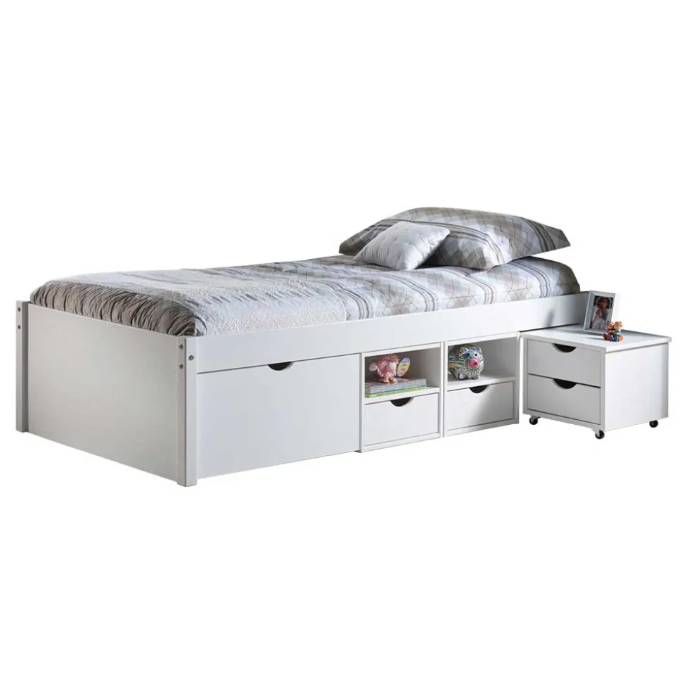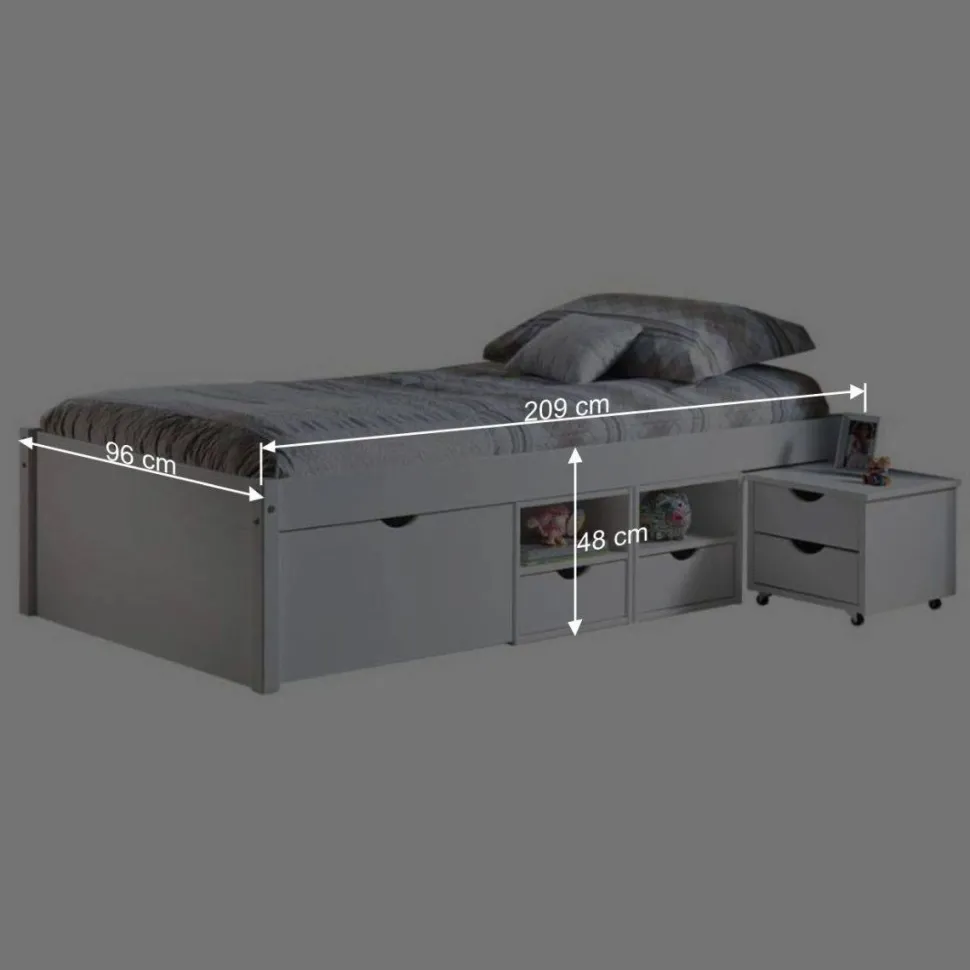 Ob Spielzeug, Kleidung oder Bücher: Unter dem Bett versteckt sich wahre Stauraumkunst. Eine große Schublade auf Rollen, vier offene Regalfächer und zwei frei positionierbare Schubkästen bieten vielfältige Aufbewahrungsmöglichkeiten – ergänzt durch eine rollbare Nachtkommode, die sich bei Bedarf ganz einfach unter das Bett schieben lässt. Dezente Griffmulden erleichtern die Handhabung und unterstreichen das zurückhaltend moderne Design.
