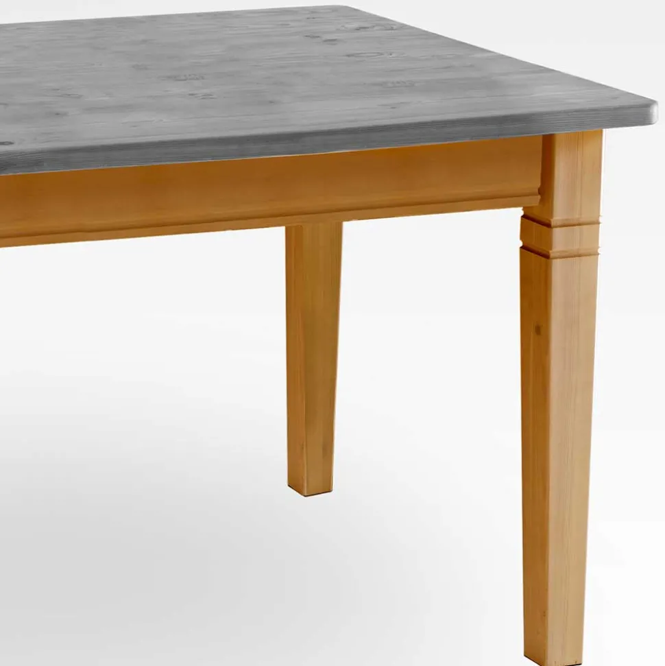 Die Oberflächen des Tisches sind in wunderschönen Laugenfarben gebeizt und geölt, was nicht nur die natürliche Maserung der Kiefer hervorhebt, sondern auch eine angenehme Haptik schafft. Die Tischplatte ist zudem in einem eleganten Grau lackiert, wodurch ein spannender Kontrast zur Kiefernholzstruktur entsteht. Die Lackierung schützt nicht nur vor Verschleiß, sondern verleiht dem Tisch auch eine zeitgemäße Note.