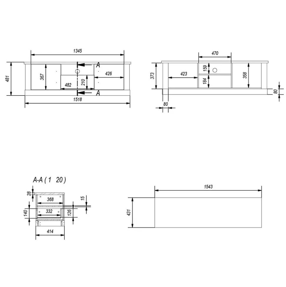 Mit Maßen von 155 cm in der Breite, 48 cm in der Höhe und 44 cm in der Tiefe bietet das TV-Board „Buleta“ reichlich Platz, um all Ihre Mediengeräte übersichtlich und stilvoll zu verstauen. Das Herzstück bildet das offene Gerätefach, dessen Innenmaße perfekt auf gängige Elektronikgeräte abgestimmt sind. Ein clever integriertes Loch in der Rückwand sorgt für eine einfache und ordentliche Kabelführung. Die Schublade mit ihrem hochwertigen Metallauszug ermöglicht einen sanften und leisen Betrieb, während die Türen mit ihren robusten Metallbeschlägen zusätzlichen Stauraum bieten, der sich hinter einem ansprechenden Design verbirgt. Die Metallknopfgriffe in Altsilberfarben verleihen dem Ganzen eine edle Note und runden das durchdachte Design ab.