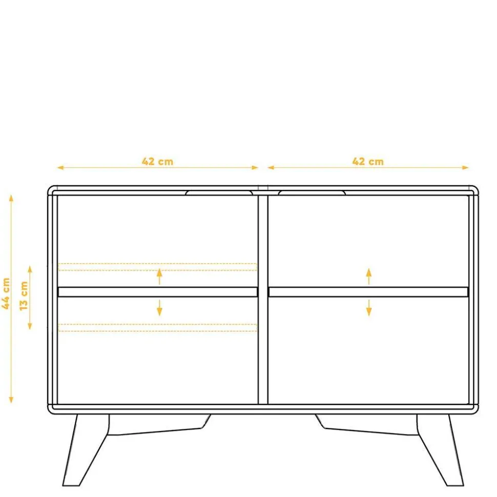 Hinter den zwei Türen, die sich durch eine ausgefräste Griffmulde grifflos öffnen lassen, befindet sich je ein verstellbarer Einlegeboden. Die Innenmaße jedes Faches betragen ca. 42×44 cm, was Ihnen Flexibilität bei der Aufbewahrung Ihrer Gegenstände bietet. Die langlebigen, gedämpften Metallbeschläge sorgen für eine sanfte und leise Handhabung der Türen.