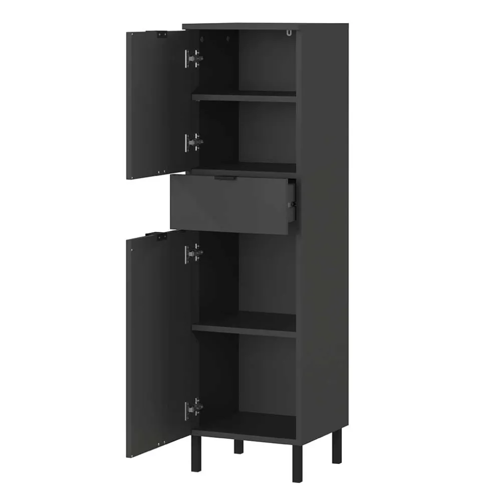 Tauchen Sie ein in zeitlose Eleganz mit der Badmöbel Kombi „Quado“, deren Design in elegantes Dunkelgrau getaucht ist. Dieses dreiteilige Set aus hochwertigem Holzwerkstoff und edlem Spiegelglas verleiht Ihrem Badezimmer nicht nur eine ästhetische Note, sondern überzeugt auch mit praktischen Merkmalen.