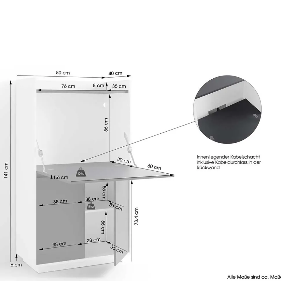 Hinter den beiden Drehtüren verbirgt sich ein durchdachter Stauraum mit einem höhenverstellbaren Einlegeboden – ideal für Unterlagen, Schreibutensilien oder Technikzubehör. Die ausklappbare Schreibplatte bietet ausreichend Arbeitsfläche und ist mit bis zu 10 kg belastbar. Der integrierte Kabeldurchlass in der Rückwand samt Kabelschacht sorgt für Ordnung auf dem Arbeitsplatz.