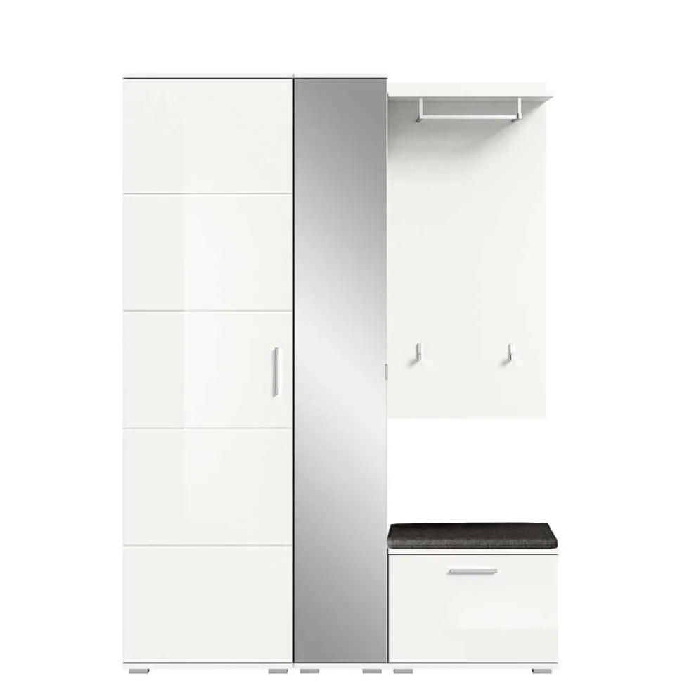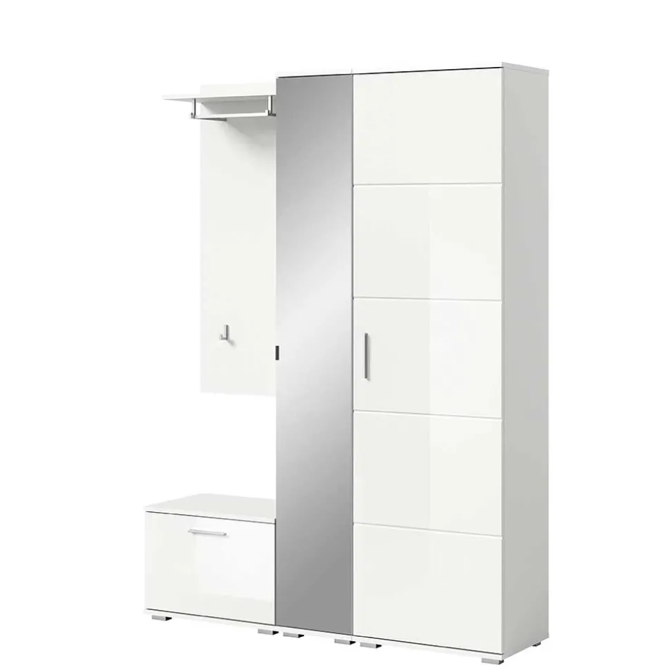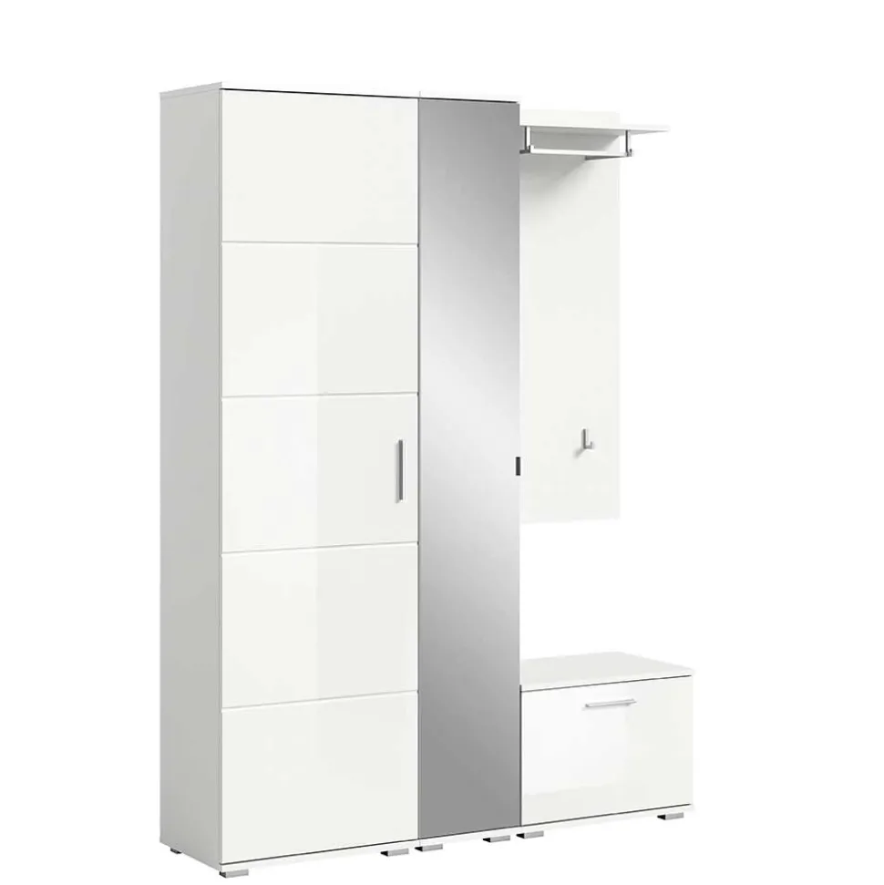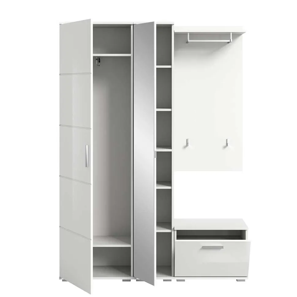 Mit einem durchdachten, modernen Design, das auf klare Formen und elegante Details setzt, strahlt das Garderobenmöbel-Set eine zeitlose Schönheit aus. Die Kombination aus matt-weiß folierten Oberflächen und den hochglänzenden Fronten in Rillenoptik lässt das Möbelstück sowohl edel als auch einladend wirken. Besonders hervorzuheben ist die Front des Spiegelschranks, die mit Spiegelglas ausgestattet ist – ein Element, das nicht nur funktional, sondern auch optisch beeindruckend ist. Der Glanz des Spiegels sowie das glänzende Weiß bringen Licht in den Raum und lassen ihn größer wirken. Diese Möbel passen sich harmonisch in jede Umgebung ein und bieten gleichzeitig eine faszinierende Mischung aus modernem Design und praktischer Funktionalität.