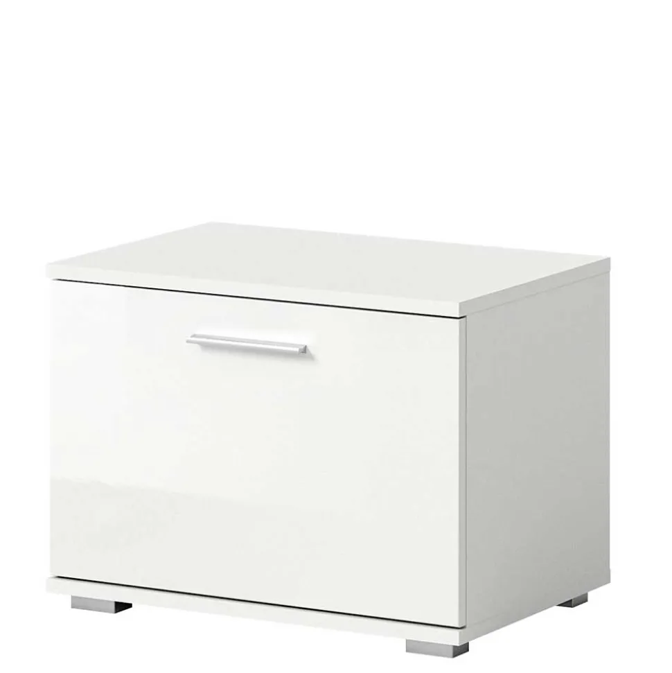 Der Schrank im Set ist ein wahres Stauraumwunder. Mit einer Tür, die beidseitig montiert werden kann, bietet er eine flexible Nutzung und lässt sich ideal an Ihre Bedürfnisse und den vorhandenen Raum anpassen. Im Inneren befinden sich eine ausziehbare Metall-Kleiderstange, ein Hutboden sowie ein Einlegeboden, die genügend Platz für Ihre Kleidung bieten. Die Tür des Schranks ist mit robusten Metallbeschlägen versehen, die für eine lange Lebensdauer und eine einfache Handhabung sorgen. Die silberfarbige Kunststoff-Griffleiste rundet das Gesamtbild des Schranks ab und fügt sich harmonisch in das Design ein. Der Schrank steht ebenfalls stabil auf silberfarbigen Kunststoff-Füßen und verfügt über eine Kippsicherung, die für zusätzliche Sicherheit sorgt.