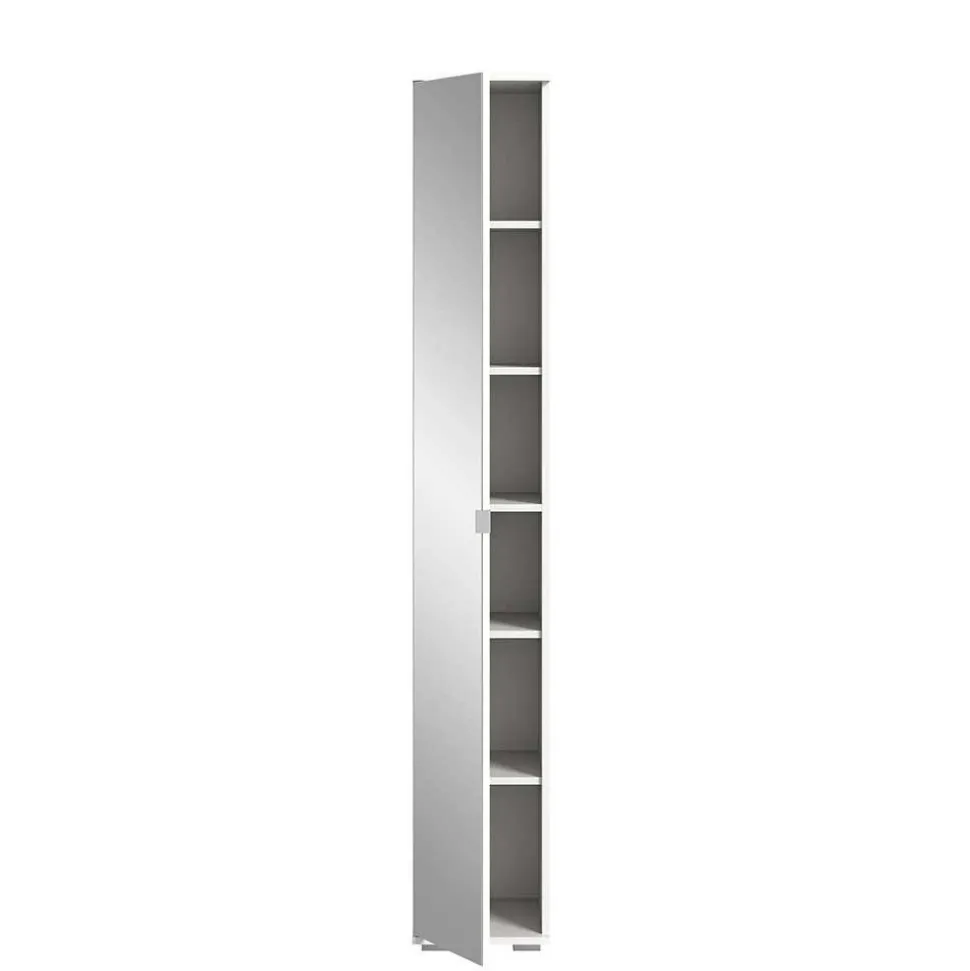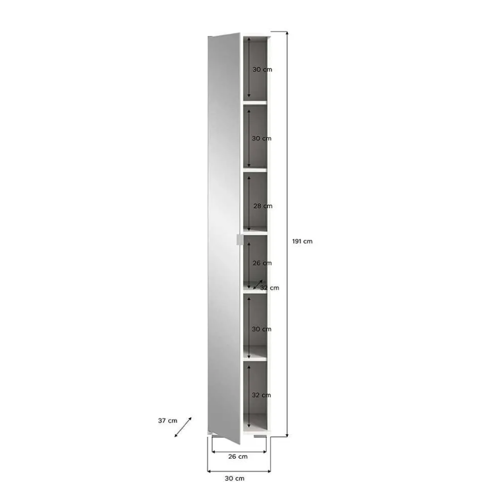 Der Spiegelschrank aus der Serie „Rugova“ ist nicht nur ein funktionales Möbelstück, sondern auch ein elegantes Highlight in Ihrem Eingangsbereich. Die Drehtür des Spiegelschranks kann beidseitig montiert werden, sodass Sie ihn ganz nach Ihren Bedürfnissen und der Raumaufteilung anpassen können. Im Inneren des Spiegelschranks finden Sie fünf höhenverstellbare Einlegeböden, die Ihnen viel Platz für Kosmetikprodukte, Accessoires oder andere Kleinigkeiten bieten. Die Tür ist mit stabilen Metallbeschlägen ausgestattet, die die Langlebigkeit und Stabilität des Schranks gewährleisten. Auch der Spiegelschrank steht sicher auf silberfarbigen Kunststoff-Füßen, und eine Kippsicherung an der Wand sorgt für zusätzliche Sicherheit.