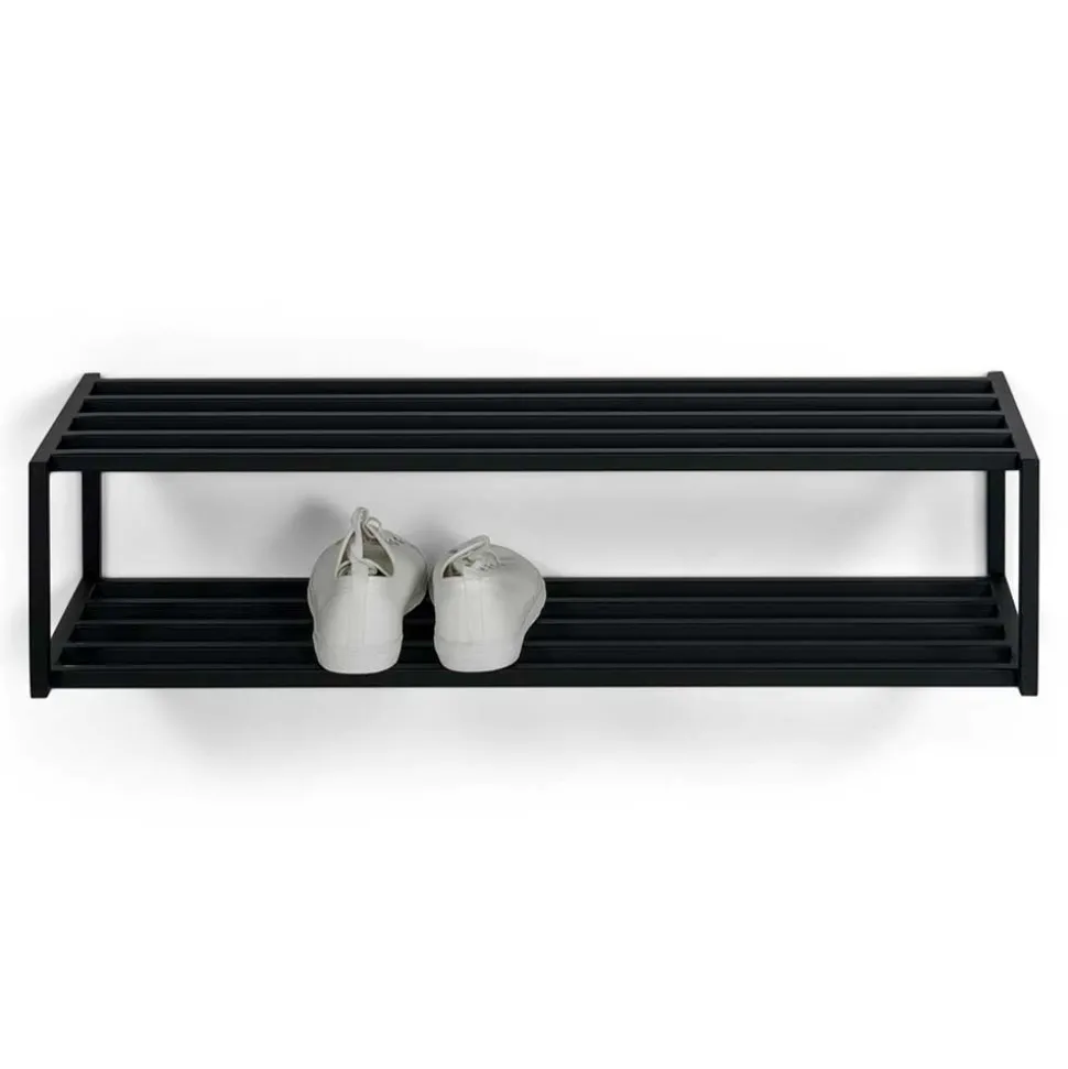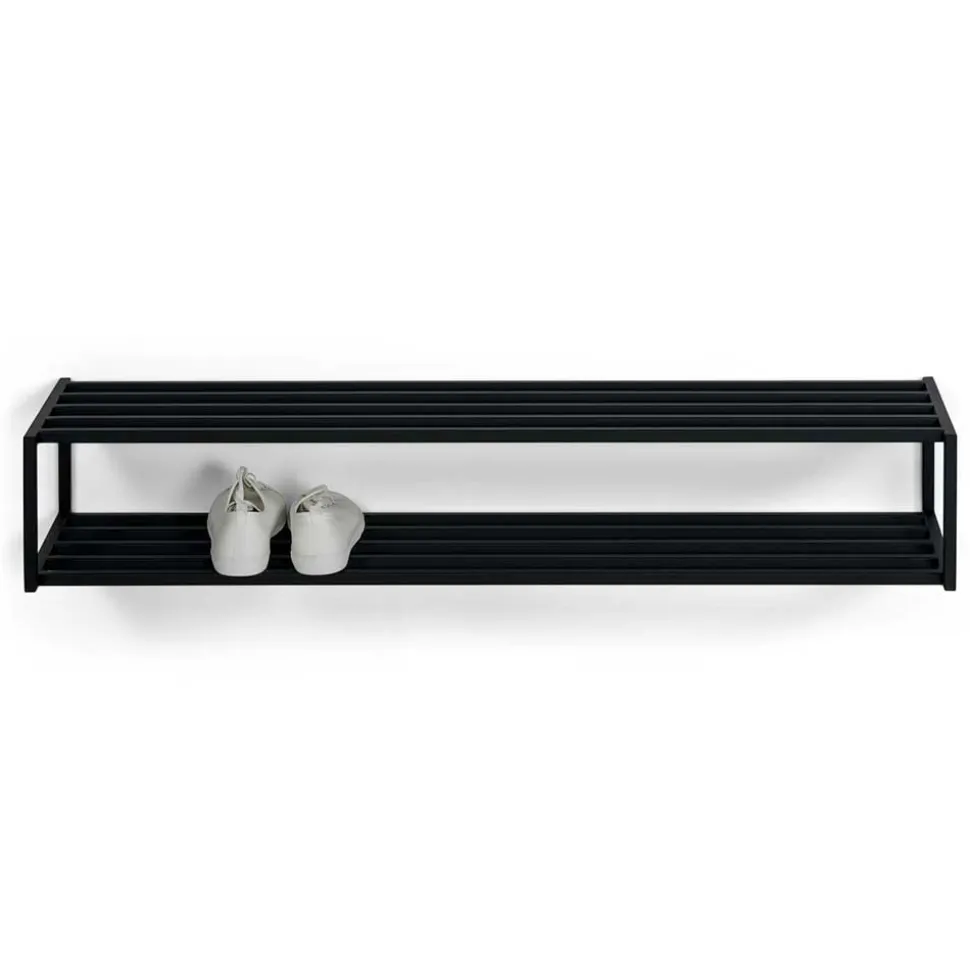 Die pulverbeschichtete Oberfläche in edlem Matt-Schwarz verleiht dem Regal eine zeitlose Eleganz und schützt gleichzeitig das Metall vor Kratzern und Korrosion. Diese hochwertige Veredelung sorgt dafür, dass das Schuhregal nicht nur gut aussieht, sondern auch im Alltag seine makellose Optik behält.