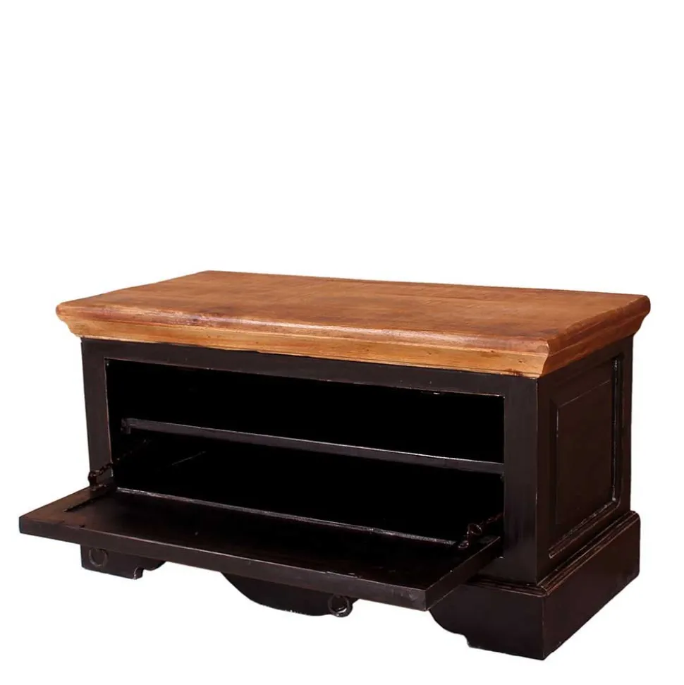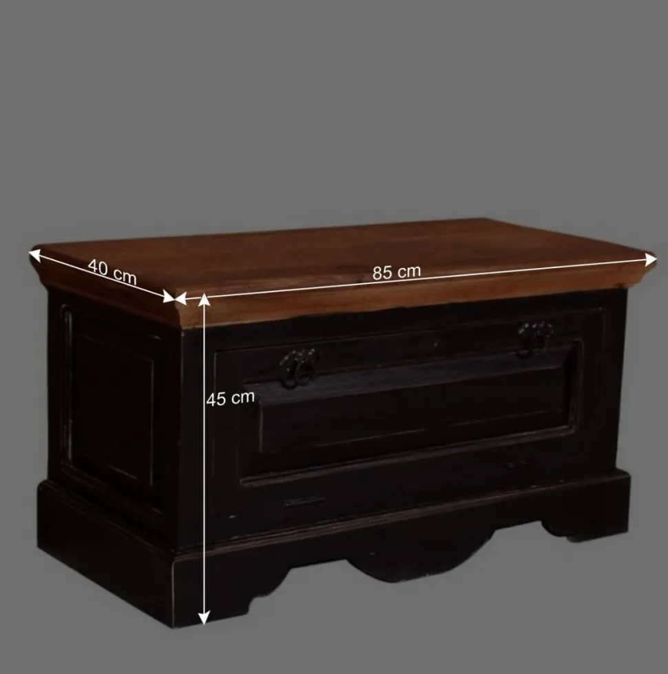 Optisch besticht das Set durch seine lackierten Oberflächen mit Antik Finish in Schwarz, die einen reizvollen Kontrast zu den honigfarbig lackierten Massivholz-Deckplatten bilden. Die beabsichtigten Gebrauchsspuren unterstreichen den rustikalen Charme des Kolonialstils und lassen jedes Stück einzigartig aussehen.