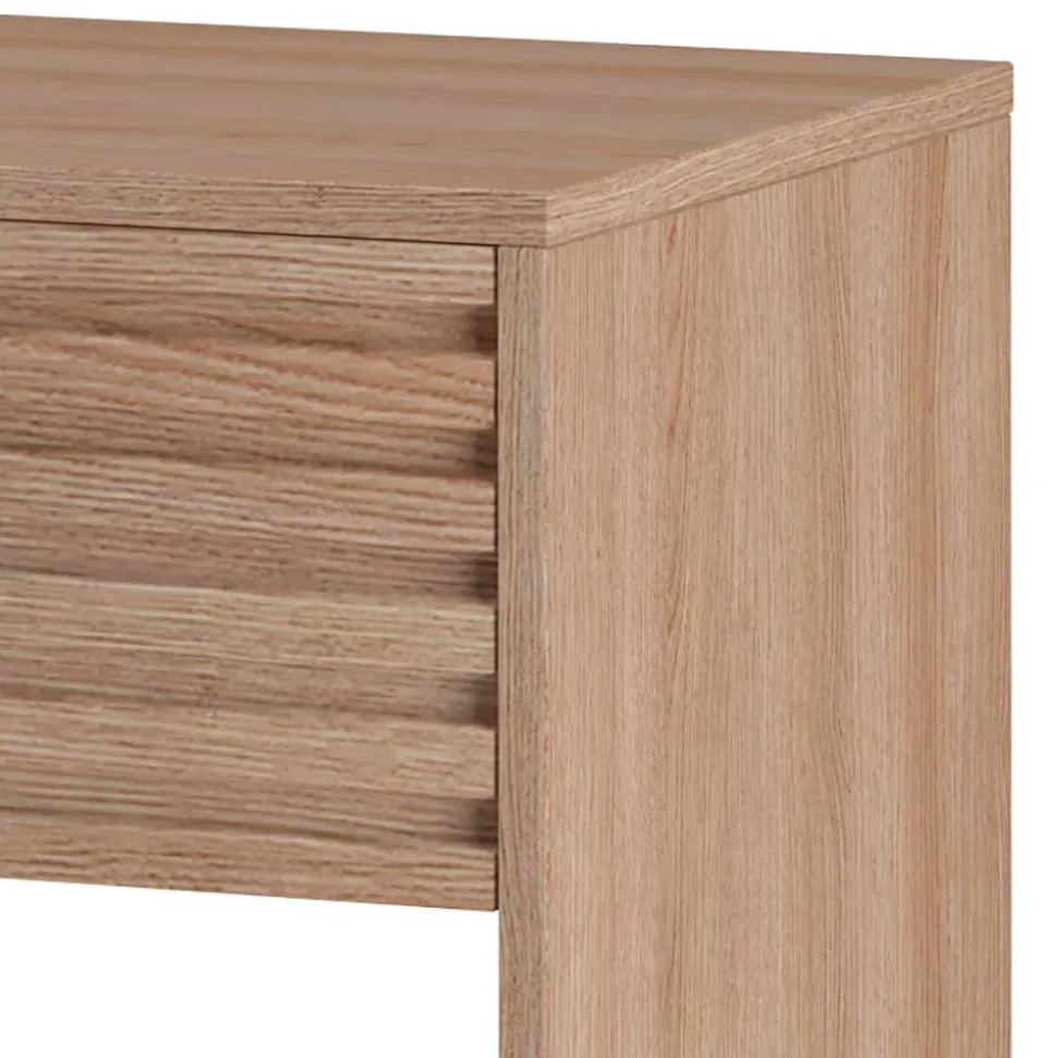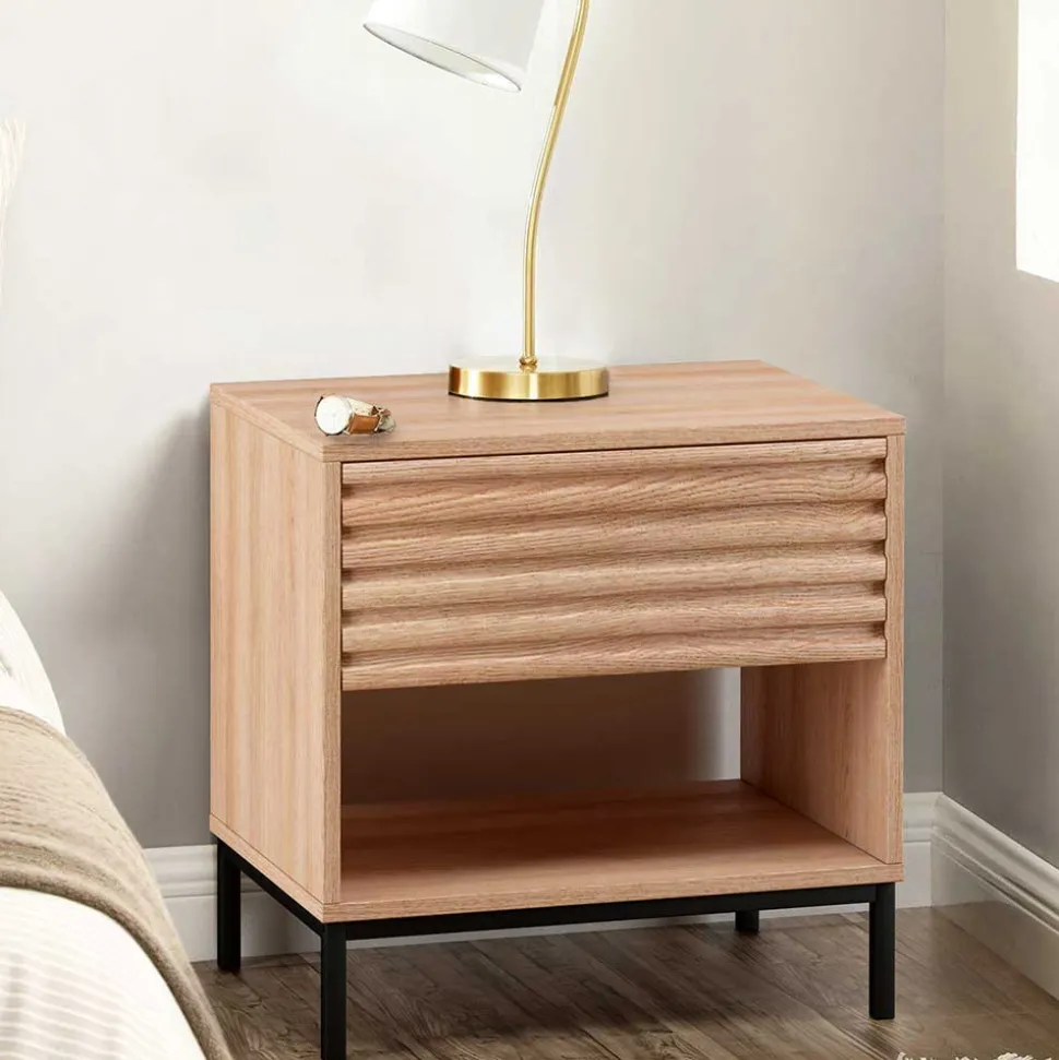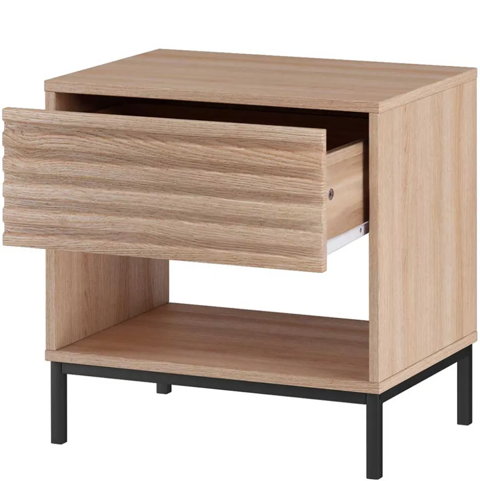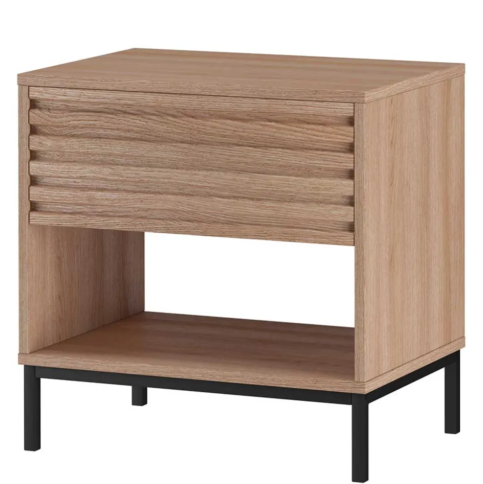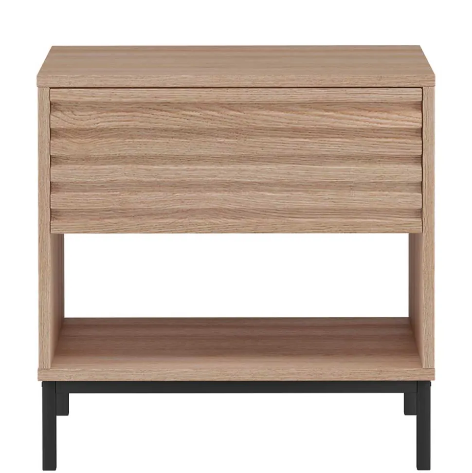 Die Nachtkommode „Lunira“ überzeugt mit einem durchdachten Stauraumkonzept. Eine geräumige Schublade mit leichtgängiger Metallauszug-Schiene und praktischer Push-to-Open-Funktion bietet Platz für persönliche Gegenstände, die Sie griffbereit aufbewahren möchten. Die Front der Schublade wird durch horizontale Rillen stilvoll in Szene gesetzt. Direkt darunter befindet sich ein offenes Fach, das zusätzlichen Platz für Bücher, Dekoration oder andere Alltagsgegenstände bietet – und das ganz ohne Rückwand für eine besonders luftige Optik.