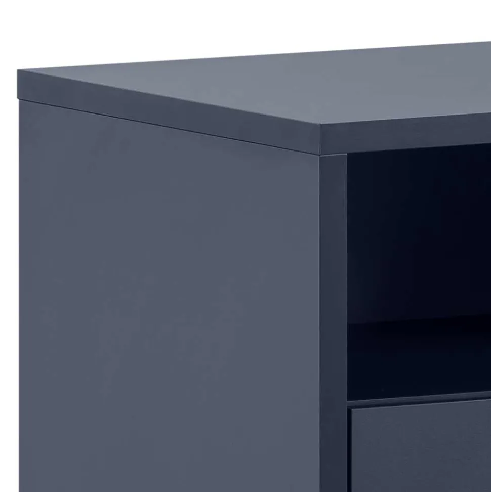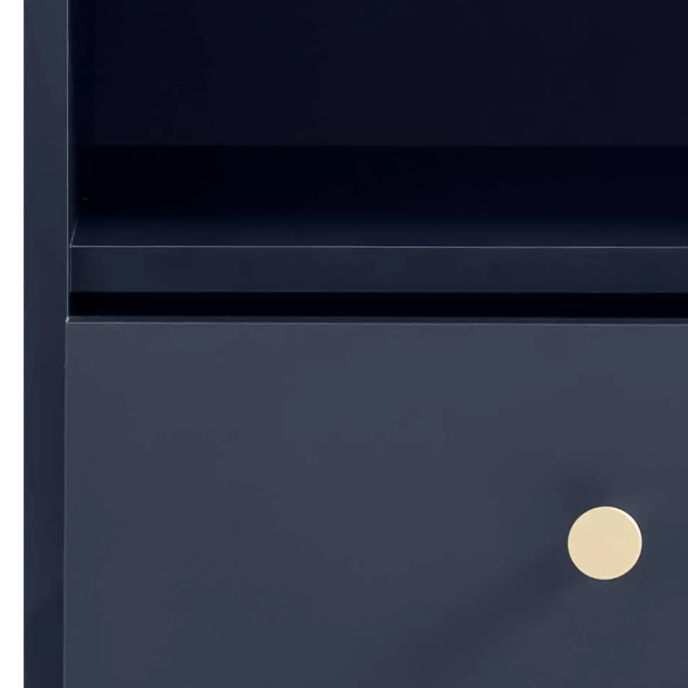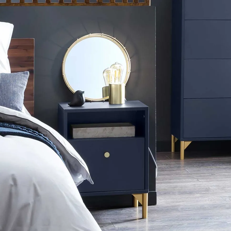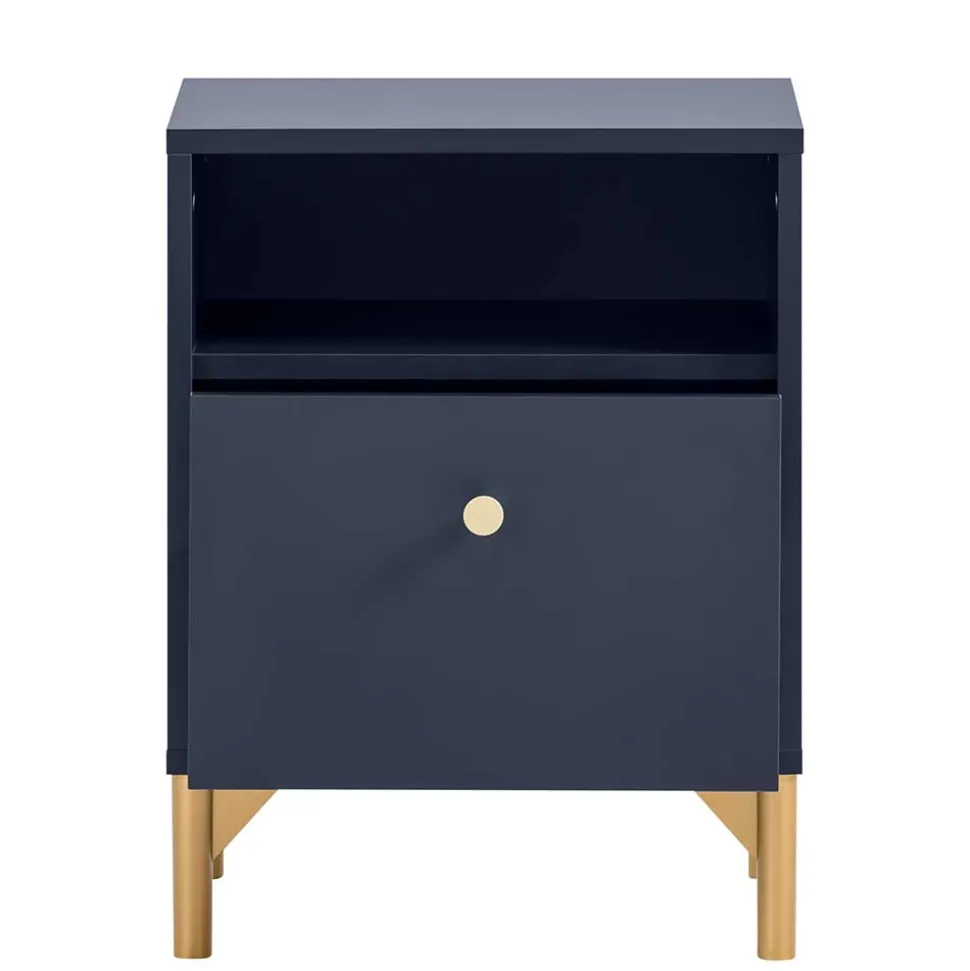 Eleganz und Qualität vereinen sich in der Nachtkommode „Inbano“. Gefertigt in Deutschland steht dieses Möbelstück für höchste Standards in Material und Verarbeitung. Das moderne Design fügt sich nahtlos in jede Einrichtung ein und setzt mit seiner dunkelblauen, melaminbeschichteten Oberfläche und den goldfarbenen Akzenten stilvolle Highlights in Ihrem Schlafzimmer.