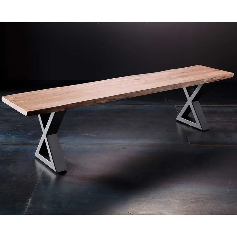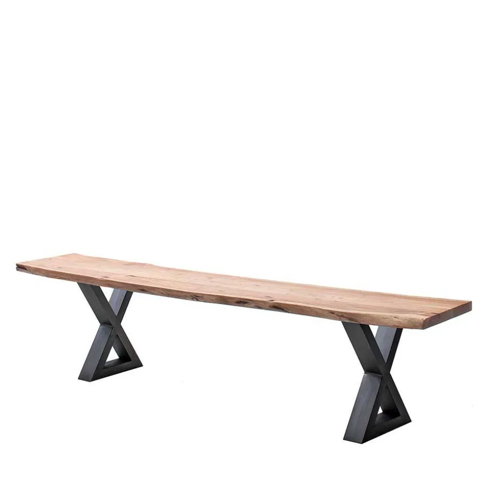 Die Bank ruht auf stylischen X-Beinen aus Metall, die in Anthrazit lackiert sind. Die breite, durchgehende Bodenauflage der Beine sorgt für optimale Stabilität und unterstreicht den industriellen Look der Bank. Diese Kombination aus rustikalem Holz und modernem Metall verleiht der „Coriba“ ihren einzigartigen Charme.