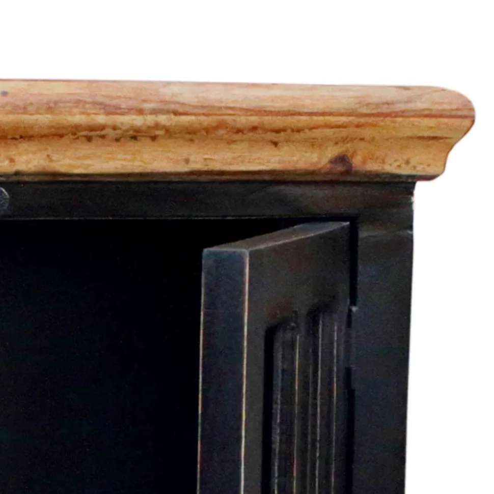 Die in Schwarz lackierten Holzoberflächen mit Antik Finish verleihen diesem Möbelstück eine attraktive mediterrane Note und unterstreichen das antike Design. Bewusst eingearbeitete Gebrauchsspuren und Abnutzungserscheinungen an den Kanten tragen zu seinem authentischen, gelebten Charme bei. Die honigfarbene Oberplatte bildet einen reizvollen Kontrast und setzt einen warmen, einladenden Akzent.