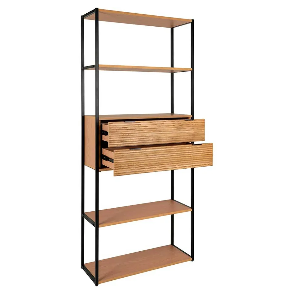 Das Regal „Lennilia“ überzeugt durch seine sorgfältige Verarbeitung und die Verwendung edler Materialien. Die Oberflächen des Holzwerkstoffs sind mit Echtholzfurnier und Lack versehen, wodurch sie besonders pflegeleicht und strapazierfähig sind. Das Metallgestell sorgt für eine stabile Konstruktion und verleiht dem Regal gleichzeitig einen industriellen Touch. Die zwei Schubladen sind mit robusten Metallauszügen ausgestattet und bieten zusätzlichen Stauraum für kleinere Gegenstände.