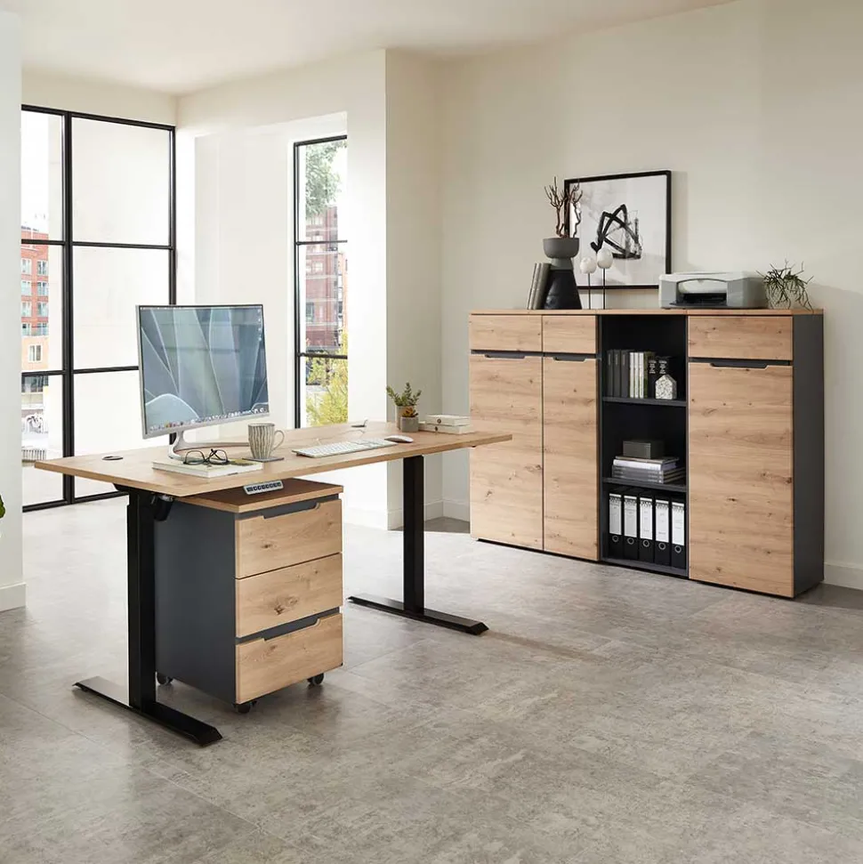 - Trendstarke Büromöbel in Wildeichefarben, Dunkelgrau und Schwarz
