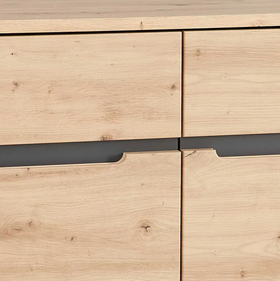 Pflegeleicht und stilvoll – die folierten Oberflächen in Holzoptik Wildeiche und Dunkelgrau sind nicht nur ein optisches Highlight, sondern auch besonders einfach zu reinigen. Ein einfaches Abwischen genügt, um die Möbel in ihrem besten Zustand zu halten. Die tiefgezogenen Kanten der Fronten verleihen den Möbeln zusätzliche Stabilität und eine hochwertige Optik.