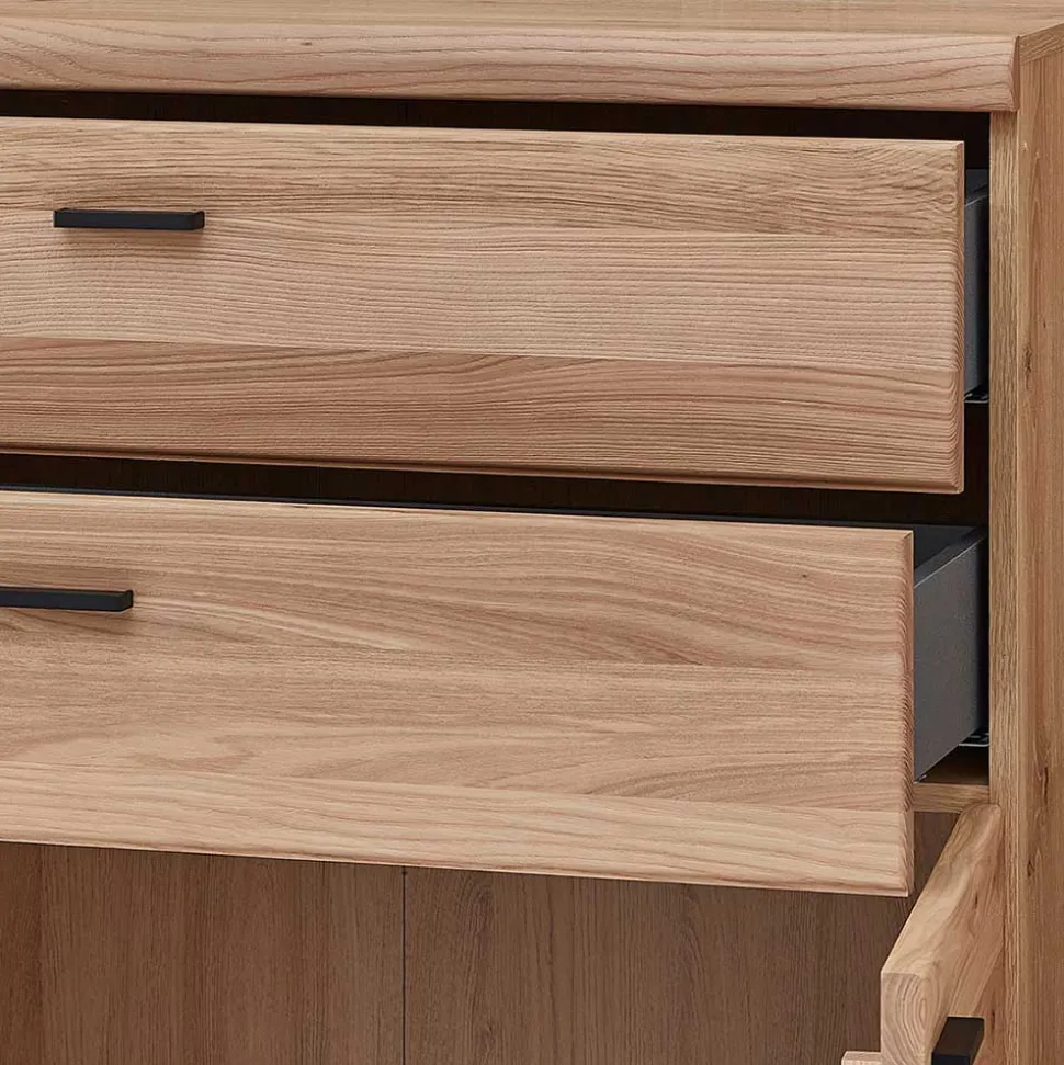 Langlebigkeit und Stabilität stehen bei diesem Möbelset im Vordergrund. Die Basis bilden hochwertige Spanplatten, kombiniert mit massiven Holzelementen, die dem Set eine besondere Wertigkeit verleihen. Die Holzoberflächen wurden sorgsam gebürstet und lackiert, was ihnen eine natürliche und doch edle Optik verleiht, die auch im täglichen Gebrauch robust bleibt. Die schwarzen Fronten sind matt foliert – eine Technik, die das Holz zusätzlich schützt und ihm eine samtige, moderne Haptik gibt. Durch diese Materialauswahl entsteht eine Kombination aus Beständigkeit und Ästhetik, die Ihnen lange Freude bereiten wird.