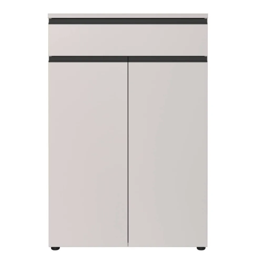 Mit seinen kompakten Maßen von 81 cm Breite, 120 cm Höhe und 40 cm Tiefe passt der Schrank mühelos in kleinere Büros, Homeoffices oder Wohnräume. Trotz seiner platzsparenden Form bietet er beeindruckend viel Stauraum. Zwei Türen mit integrierter Dämpfung ermöglichen leises Schließen – ein spürbares Komfortmerkmal im Alltag.