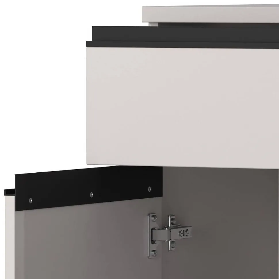 Metallbeschläge im Inneren des Schranks garantieren eine lange Lebensdauer. ABS-Kanten schützen effektiv vor Stößen und mechanischen Belastungen – perfekt für viel genutzte Möbel. Die maximale Traglast der Deckplatte und der Einlegeböden liegt bei jeweils 22 kg, der Unterboden hält sogar bis zu 30 kg aus.