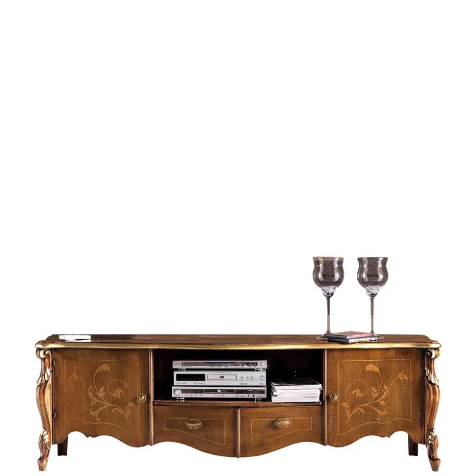 Hergestellt aus massivem Tulpenbaum- und Pappelholz sowie Holzwerkstoffen, besticht das TV-Board Carlenna auch durch seine erstklassige Verarbeitung. Das Tulpenbaumholz ist im Bereich der massiven Holzbeine sowie ausladenden Seitenelementen mit den markanten Acanthus-Schnitzereien zu finden, während das Pappelholz in der Fertigung der Schubladen sowie für die floralen Einlegearbeiten (handgearbeitete Intarsien) eingesetzt wird. Die Seitenteile des TV Boards bestehen wie die Rückwand aus Schichtholz (mehrfach verleimtes Tannenholz). Für die Herstellung der Deckplatte wird MDF verwendet. Farblich ist das TV Board durch Furnier und Lackierung in apartem Nussbaum Braun gehalten, wobei bestimmte dekorative Elemente in Goldfarben hervorgehoben sind. Die schnörkelig ausgeführten Knopfgriffe sind wie die Beschläge aus Metall.