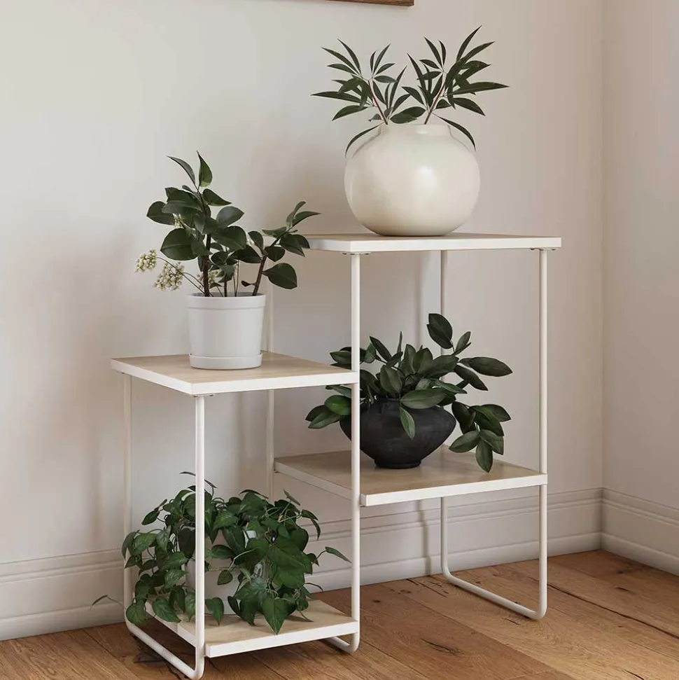 Der Blumenständer besteht aus hochwertigem Holzwerkstoff (MDF) und robustem Metall. Die Oberflächen in Holzoptik sind sorgfältig foliert, während die Tischplatten mit einem weißen Rand gestaltet sind. Die Bügelgestelle aus weiß pulverbeschichtetem Metall verleihen dem Möbelstück einen modernen Touch und gewährleisten zugleich Stabilität und Langlebigkeit.