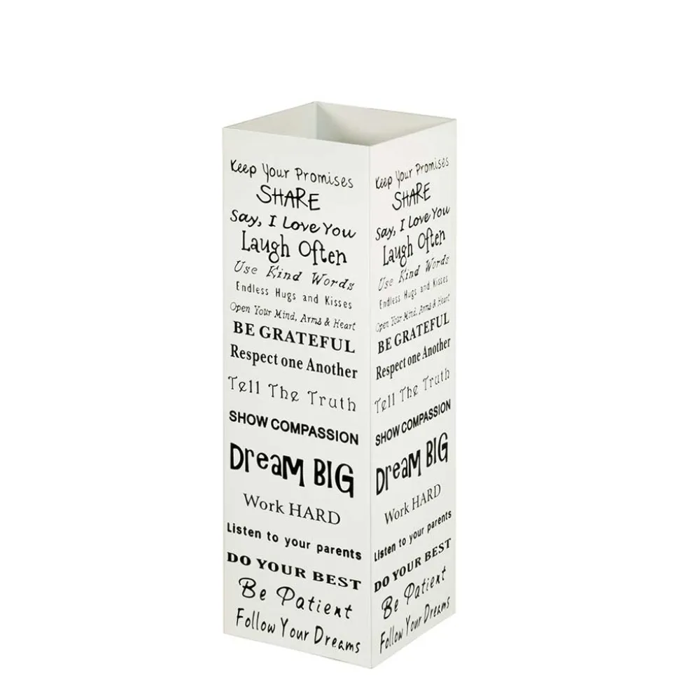 Der Regenschirmständer „Angoro“ bringt nicht nur Ordnung in Ihren Eingangsbereich, sondern auch eine Portion gute Laune. In strahlendem Weiß gehalten und rundum mit stilvollen, englischsprachigen Motivationssprüchen wie „Dream Big“ (Träume groß), „Be grateful“ (Sei dankbar) oder „Laugh Often“ (Lache oft) versehen, wird er zum inspirierenden Designobjekt. Unterschiedliche Schriftarten und die kontrastreiche Gestaltung in Schwarz verleihen dem Ständer eine moderne, dynamische Ausstrahlung.
