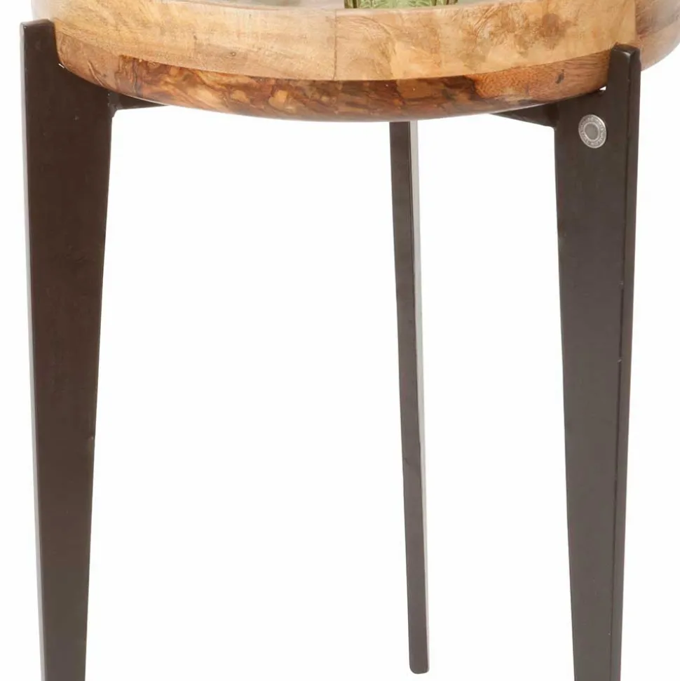 Mangobaumholz ist nicht nur für seine Haltbarkeit und Festigkeit bekannt, sondern besticht auch durch seine umwerfende Ästhetik. Die natürliche Maserung und die lebhaften Farbschattierungen des Holzes kommen durch eine sorgfältige, naturfarbene Lackierung besonders gut zur Geltung, die nicht nur schützt, sondern auch das Erscheinungsbild veredelt. Das Dreifußgestell aus Metall bietet Stabilität und fügt sich nahtlos in das Gesamtbild ein, während die schwarze Lackierung einen modernen Kontrast schafft.