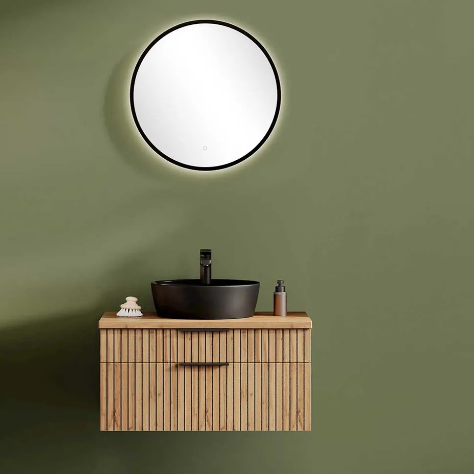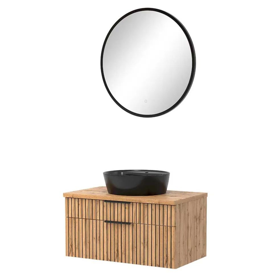 Gefertigt aus robuster Spanplatte mit melaminbeschichteter Oberfläche zeigt sich die Waschtisch-Kombination nicht nur optisch reizvoll, sondern auch funktional. Melamin sorgt für eine widerstandsfähige, kratzfeste und pflegeleichte Oberfläche – perfekt für den täglichen Einsatz im Badezimmer. Die Frontgestaltung in edler Rillenoptik verleiht dem Möbel ein fühlbares Designstatement, während der schwarze Hintergrund einen stimmigen Rahmen bildet. Der Spiegel aus hochwertigem Spiegelglas wird von einem runden, matt schwarz lackierten Metallrahmen eingefasst – stilvoll, stabil und voll im Trend.