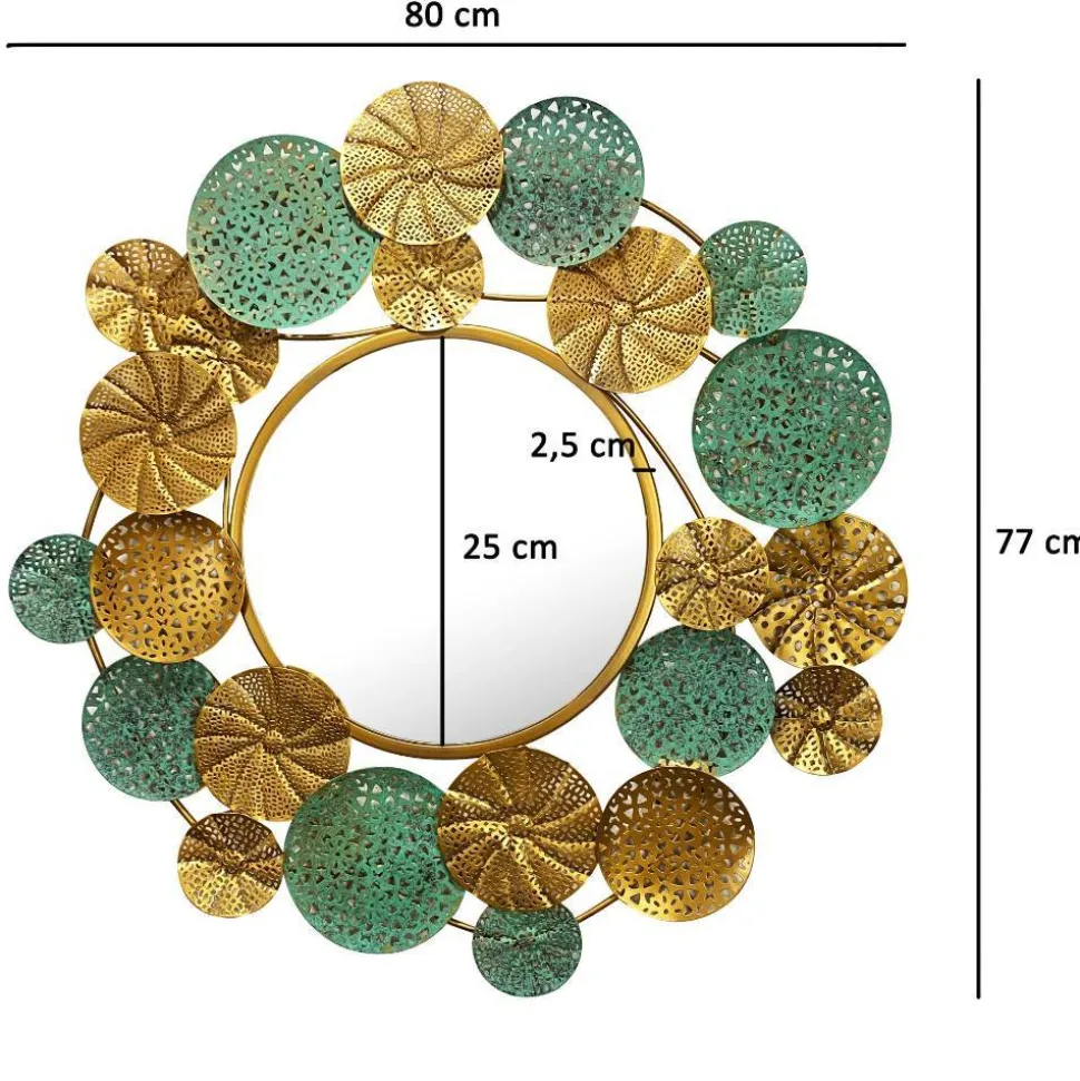 Der Spiegel „Biljana“ besteht aus erstklassigem Spiegelglas und robustem Metall. Der raffiniert gestaltete Metallrahmen besticht durch scheibenförmige Elemente in unterschiedlichen Größen, die sich teils überlappen und eine spannende Struktur bilden. Einige der Scheiben sind gelöchert oder unterschiedlich bearbeitet und setzen mit ihrer teils grünen Patina aufregende Akzente. Diese kunstvolle Gestaltung sorgt für ein optisches Aufbrechen der geometrischen Form und macht den Spiegel zu einem Unikat – leichte Unterschiede zum Foto unterstreichen die Handwerkskunst.