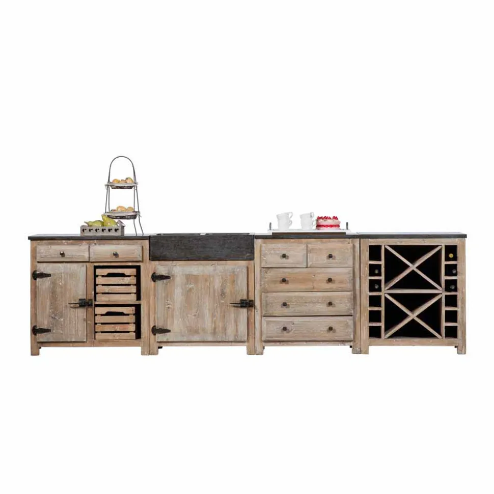 Die Küchenzeile „Ashvills“ besteht aus recyceltem Pinien-Massivholz, Holzwerkstoffen und robustem Naturstein, was für extreme Langlebigkeit sorgt. Die Kombination dieser Materialien verleiht der Küche einen natürlichen und authentischen Charakter, der sich perfekt in jedes rustikale oder Landhaus-Interieur einfügt. Die massiven Deckplatten aus Naturstein sind nicht nur optisch ansprechend, sondern auch widerstandsfähig und pflegeleicht – perfekt für den täglichen Gebrauch. Die schwarzen Metallbeschläge in nostalgischer Optik runden das Gesamtbild harmonisch ab.