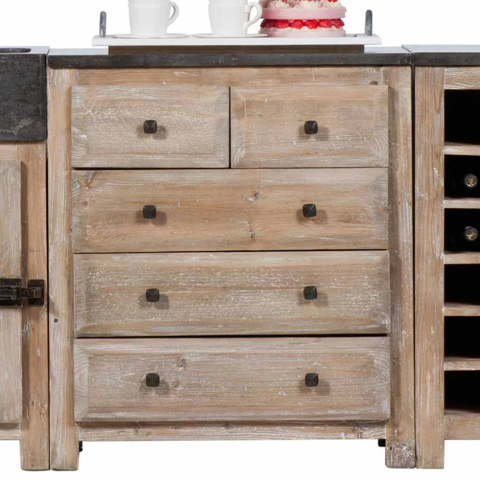 Rustikaler Stil steht für natürliche Materialien, warme Farben und handwerkliche Details. Bei der Küchenzeile „Ashvills“ wird dieser Charakter durch das verwendete recycelte Pinienholz in Kombination mit robustem Naturstein perfekt eingefangen. Recyceltes Pinienholz bringt die natürliche Schönheit des Holzes zum Vorschein und überzeugt mit seiner Nachhaltigkeit. Zudem sorgt die Antikfinish-Behandlung der Holzoberflächen für eine charmante Patina, die das Gefühl von Vintage und Nostalgie vermittelt – gewollte Gebrauchsspuren machen jedes Möbelstück zu einem Unikat.