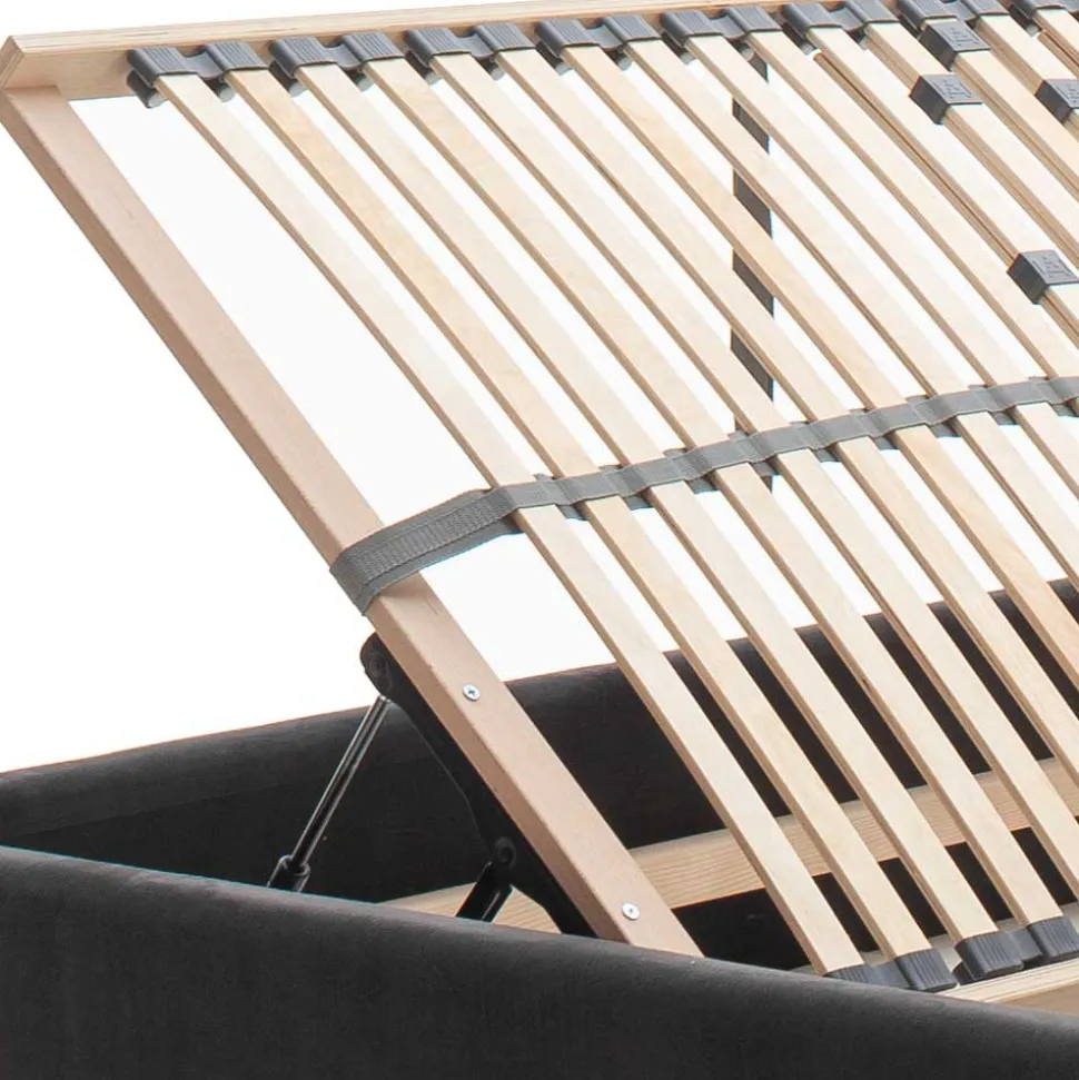 - Belüftete Bettkästen bieten viel Stauraum, Lattenroste seitlich per Gasdruckfedern hochklappbar