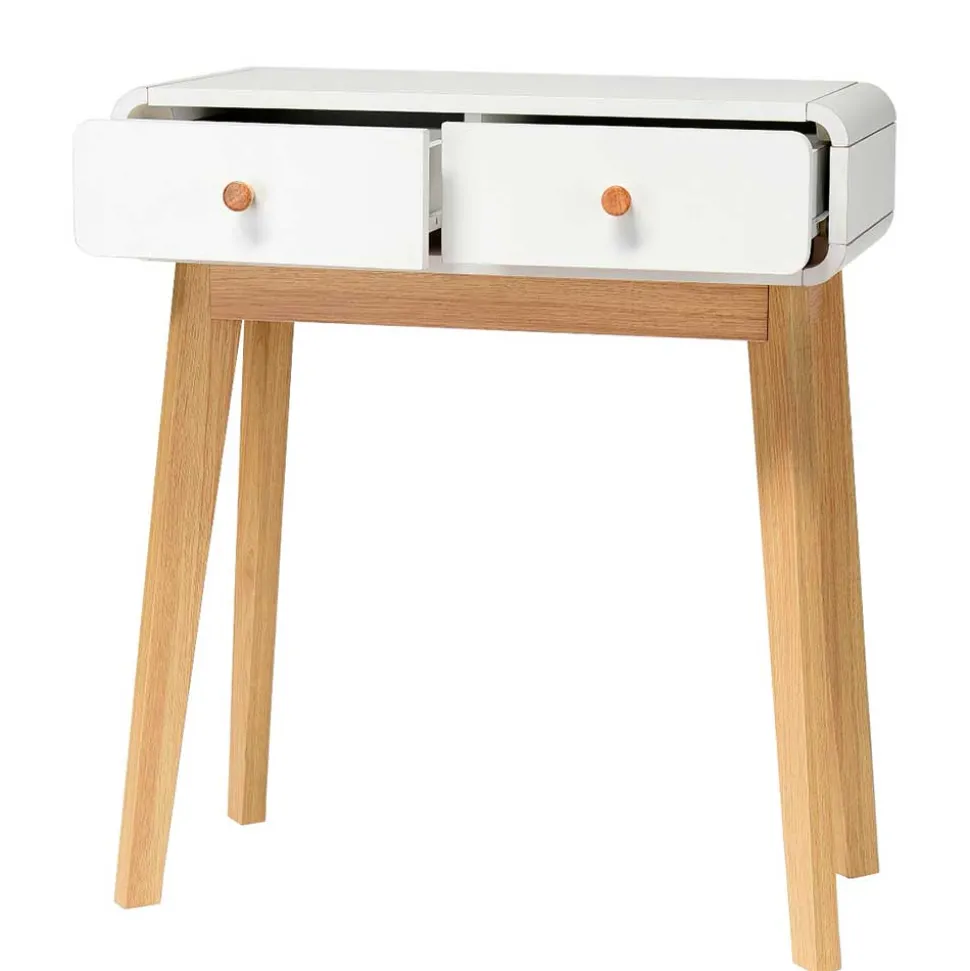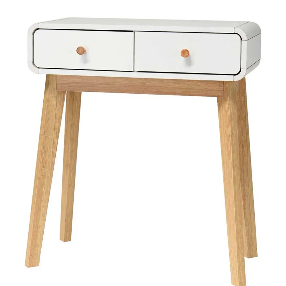 Dezent abgerundete Ecken verleihen dem Möbelstück eine sanfte Optik und sorgen für mehr Sicherheit – ideal auch für Haushalte mit Kindern. Die schräg gestellten Beine in Holzoptik-Eiche setzen einen warmen Kontrast zum strahlenden Weiß der Tischplatte und unterstreichen den skandinavischen Charme. Die runden Holz-Knopfgriffe fügen sich harmonisch ins Gesamtbild ein und sorgen für eine angenehme Haptik beim Öffnen der Schubladen.