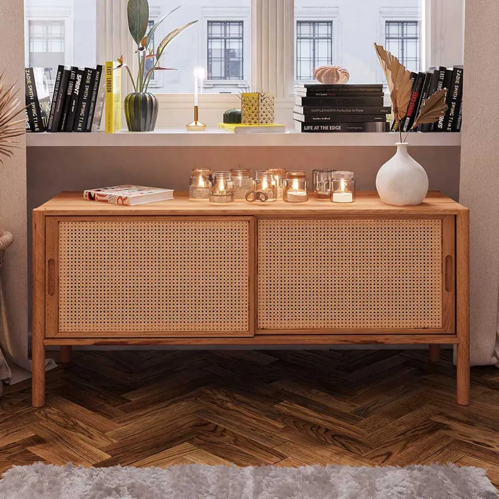 Das Lowboard bietet mit seinen Maßen von 142 cm Breite, 64 cm Höhe und 46 cm Tiefe viel Stauraum. Zwei praktische Schiebetüren sorgen für eine einfache Handhabung und einen schnellen Zugriff auf das Innere des Möbelstücks. Schiebetüren sind platzsparend und ermöglichen auch in engen Raumverhältnissen eine komfortable Nutzung. Das besondere Highlight sind die Türfronten im Stil des Wiener Geflechts, handgefertigt aus Rattan. Das Wiener Geflecht ist ein traditionelles Handwerk, bei dem Rattan in einer kunstvollen Weise geflochten wird, wodurch die Fronten nicht nur optisch beeindrucken, sondern auch für eine angenehme Belüftung sorgen.