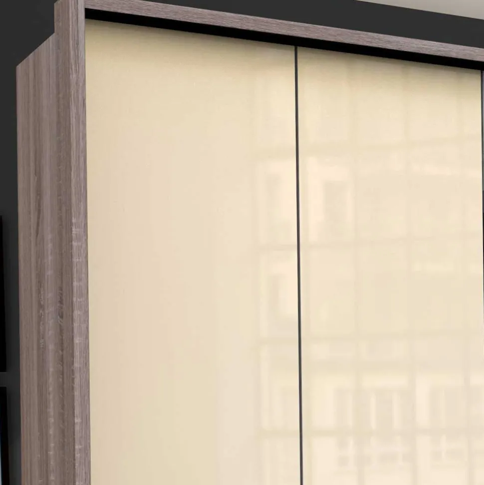 Robuste Spanplatte bildet das Herzstück des Kleiderschranks, welches ihn stabil und widerstandsfähig macht. Umhüllt wird dieser starke Kern vom Korpus in einer Holzoptik, Eiche Trüffelfarben foliert. Das Folieren bietet nicht nur eine ansprechende und realitätsnahe Holzoptik, sondern schützt auch vor äußeren Einwirkungen und gewährleistet eine einfache Reinigung. Als optisches Kontrastmittel sind die Fronten in einem eleganten Cremefarben gehalten und mit Glas beschichtet, was ihnen eine edle Note verleiht.