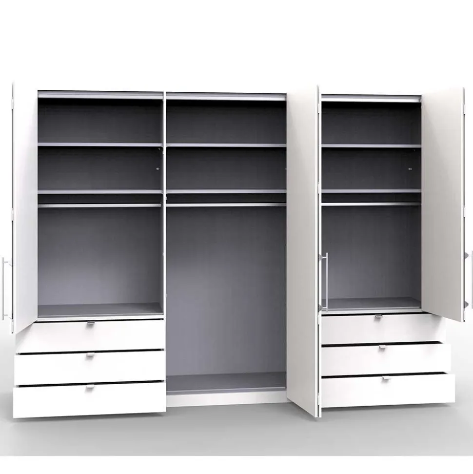 Der 300 cm große Falttürenschrank ist ein wahres Highlight dieses Sets. Mit seinen drei Panorama-Falttüren in der Sechs-Türen-Optik bietet er nicht nur ausreichend Stauraum, sondern spart auch Platz, da die Türen platzsparend nach vorn gezogen werden. Die Schubladen verfügen über einen Metallauszug, Soft-Close-Funktion und Selbsteinzug, was für ein geräuschloses Schließen und eine mühelose Bedienung sorgt. Die Beschläge und Kleiderstangen sind aus hoch belastbarem Metall gefertigt und garantieren eine lange Lebensdauer. Die edlen Metallgriffe und -leisten verleihen den Möbeln zusätzlich eine elegante Note.
