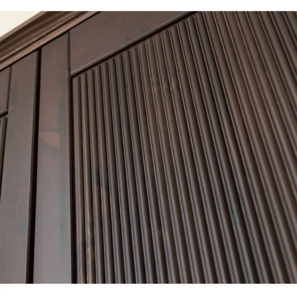 Gefertigt aus massivem Kiefernholz besticht der Kleiderschrank „Nauizia“ durch seine natürliche Ausstrahlung und Stabilität. Die gebeizte Oberfläche mit einer Deckkraft von rund 70 % lässt die charakteristische Maserung der Kiefer sichtbar durchscheinen, wodurch jeder Schrank seinen individuellen Charakter erhält. Die formschöne, leicht überstehende Deckplatte mit klassischem Profil rundet das edle Erscheinungsbild stilvoll ab.