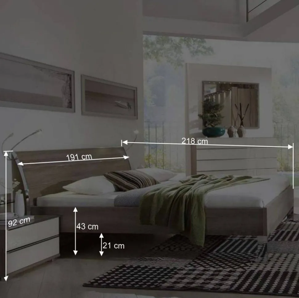 Zur Fertigung der Schlafzimmer Möbel kommt solide Spanplatte mit dekorativer Folierung in dunkler Eiche Optik (Trüffeleiche) zum Einsatz (Bett, Korpus der Schrankmöbel). An den Fronten von Türen und Schubladen gibt es zudem eine glanzvolle Beschichtung aus cremefarbenem Glas, welche sehr pflegeleicht ist.