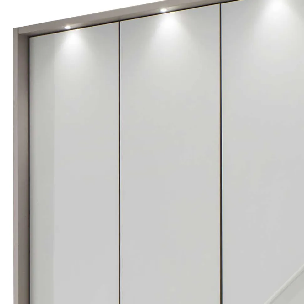 Der Falttüren-Kleiderschrank, ein wahrer Stauraumgigant, kommt mit einem Passepartoutrahmen, der durch sechs eingebaute LED-Leuchten stimmungsvoll in Szene gesetzt wird. Die Soft Close Funktion und der Selbsteinzug aller Schubladen sorgen für eine geräuschlose und sanfte Handhabung. Lange Griffleisten aus Metall unterstreichen das moderne Design und erleichtern die Bedienung.