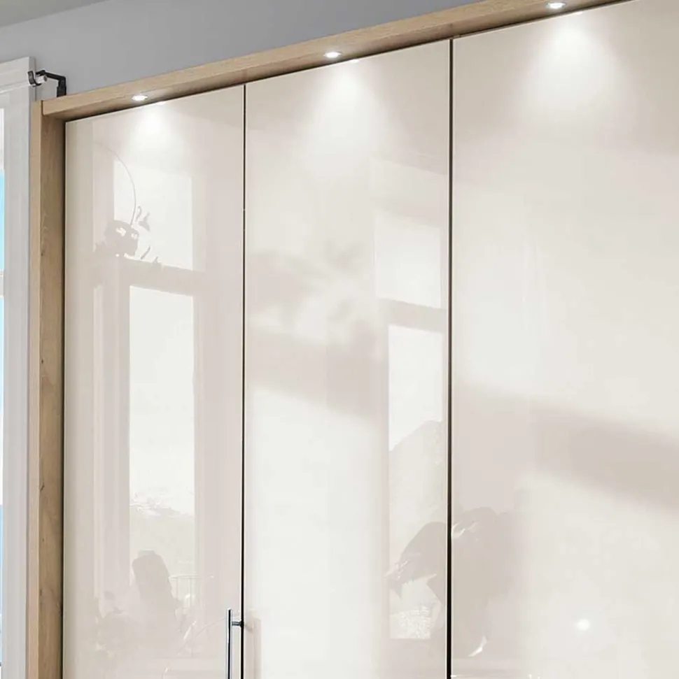 - Oberflächen der Front von Schrank und Nachtkommoden mit Glas in Beige beschichtet, Korpus in Holzoptik Eiche Bianco foliert